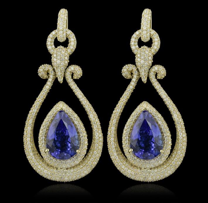One pair electronically tested 14KT yellow gold ladies cast & assembled tanzanite and diamond earrings with standard backs. Each earring features a tanzanite set within elaborate diamond bezels, completed by a diamond set drop. Bright polish finish. Identified with markings of "14K". Condition is new, good workmanship. Containing: Two prong set pear mixed cut natural tanzanite, measuring 15.50 x 10.00 x 7.00mm, 20% bulge factor, approximate total weight of 17.82ct., clarity is eye clean, type I, medium dark, moderately strong, violetish blue color, (GIA Vb 6/4), cut is good. Transmitting light with no distortion, transparent. Measurements & the color graded are an average for the pair. Graded in the setting. Tanzanite is a very rare gemstone that is only found in the country of Tanzania. Originally discovered in 1967. Tiffany & Company, named the stone tanzanite. It is found in the Usumburu Mountains that border the umba valley of northern tanzanite. Tanzanite occurs in gray, brown, violet, blue, reddish-purplish & green. The gem is interesting because of its exceptional pleochroism. Rotated in different directions a tanzanite will exhibit multiple change of color. Tanzanite has a low tolerance to ultrasonic cleaning, and should not be cleaned using this method. Numerous pave set round brilliant cut diamonds, measuring 1.50 -- 1.20 x 0.81mm (depth est.) approximate total weight of the stones = 7.32ct. Graded in the setting. Clarity SI-1 to I-1. Color G-I. Total weight of Tanzanite 17.82ct. Total weight of Diamonds 7.32ct. Total weight of Earrings 25.84gm. AIG Appraised at $73,755.00.