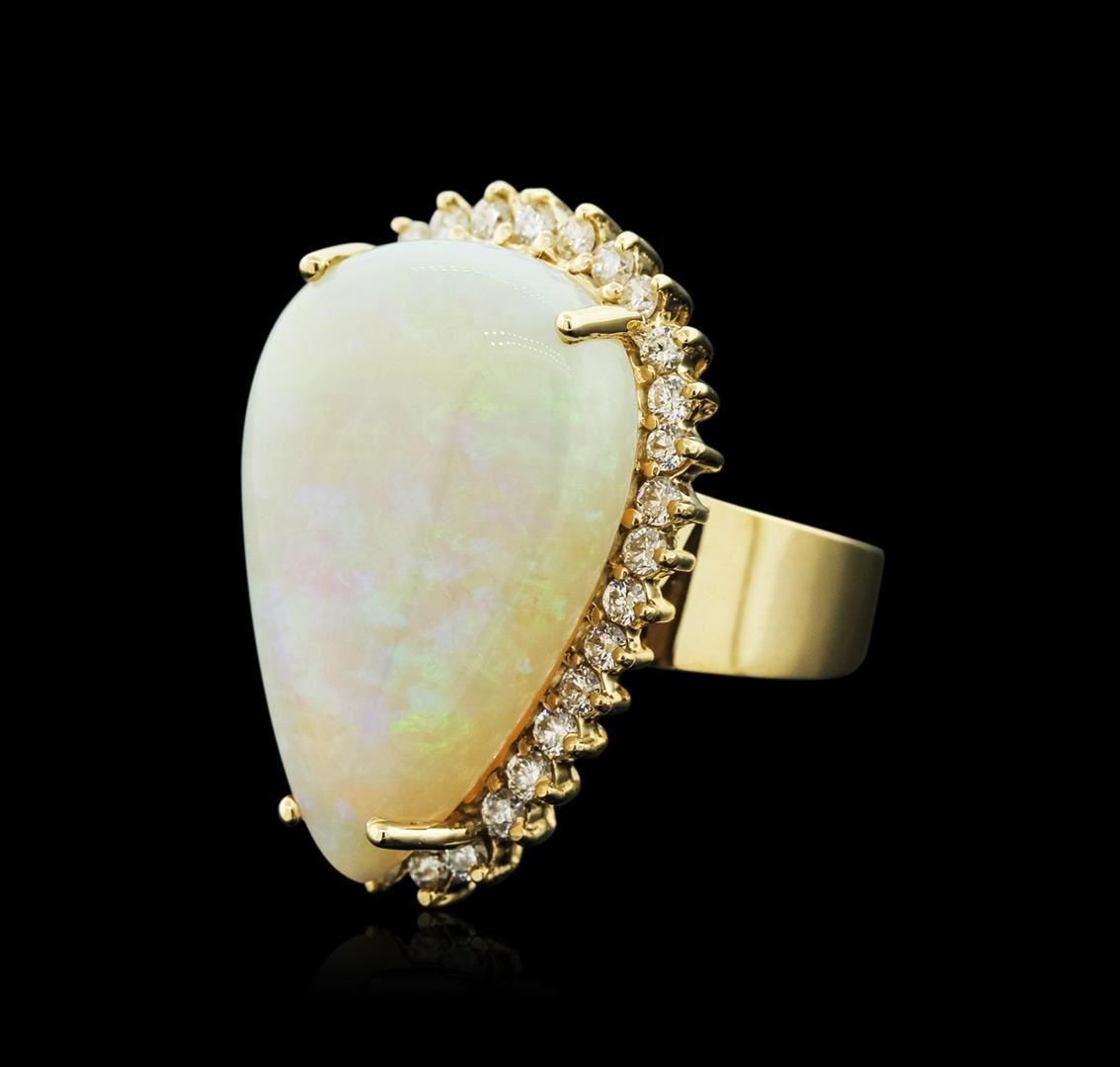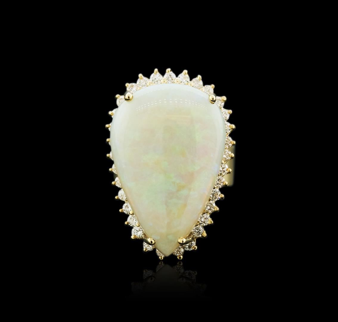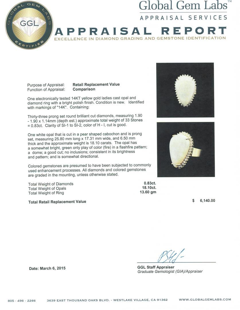 One electronically tested 14KT yellow gold ladies cast opal and diamond ring with a bright polish finish. Identified with markings of "14K". Condition is new. Containing: Thirty-Three prong set round brilliant cut diamonds, measuring 1.90 - 1.90 x 1.14mm (depth est.) approximate total weight of 33 Stones = 0.83ct.. Clarity: SI-1 to SI-2. Color: H - I, Cut is Good. One white opal that is cut in a pear shaped cabochon and is prong set, measuring 25.80 mm long x 17.31 mm wide, and 6.50 mm thick and the approximate weight is 18.10 carats. The opal has a somewhat bright, green only play of color (fire) in a flashfire pattern; a dome; a good cut; no inclusions; consistent in its brightness and pattern; and is somewhat directional. Colored gemstones are presumed to have been subjected to commonly used enhancement processes. All diamonds and colored gemstones are graded in the mounting, unless otherwise stated.. Total Weight of Diamonds 0.83ct.. Total Weight of Opals 18.10ct.. Total Weight of Ring 13.60 grams. GGL Appraised at $6,140.00.