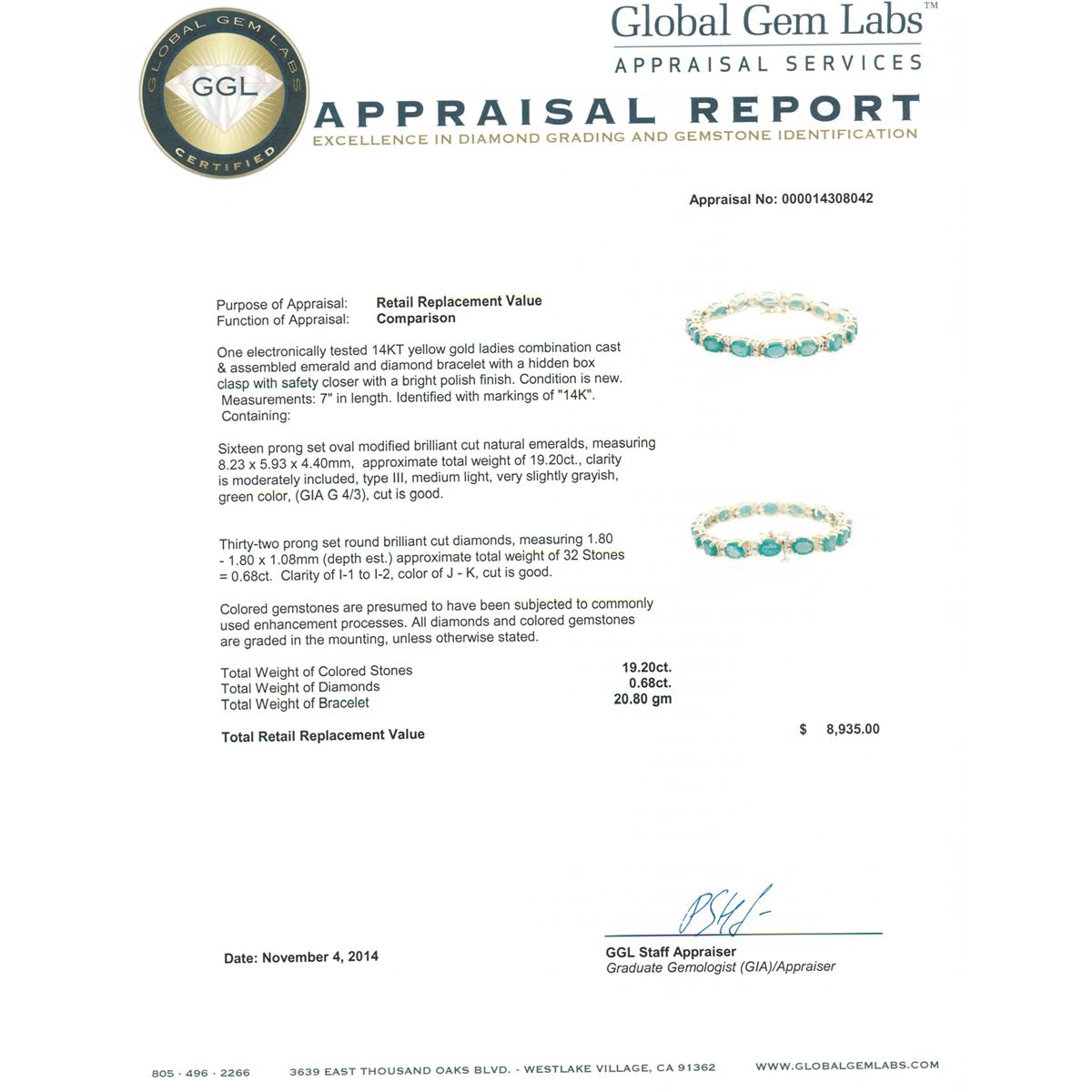 One electronically tested 14KT yellow gold ladies combination cast & assembled emerald and diamond bracelet with a hidden box clasp with safety closer with a bright polish finish. Measurements: 7" in length. Identified with markings of "14K". Condition is new. Containing: Sixteen prong set oval modified brilliant cut natural emeralds, measuring 8.23 x 5.93 x 4.40mm, approximate total weight of 19.20ct., clarity is moderately included, type III, medium light, very slightly grayish, green color, (GIA G 4/3), cut is good. Thirty-Two prong set round brilliant cut diamonds, measuring 1.80 - 1.80 x 1.08mm (depth est.) approximate total weight of 32 Stones = 0.68ct. Clarity: I-1 to I-2. Color: J - K, Cut is Good. Colored gemstones are presumed to have been subjected to commonly used enhancement processes. All diamonds and colored gemstones are graded in the mounting, unless otherwise stated. Total Weight of Colored Stones 19.20ct. Total Weight of Diamonds 0.68ct. Total Weight of Bracelet 20.80 grams. GGL Appraised at $8,935.00.