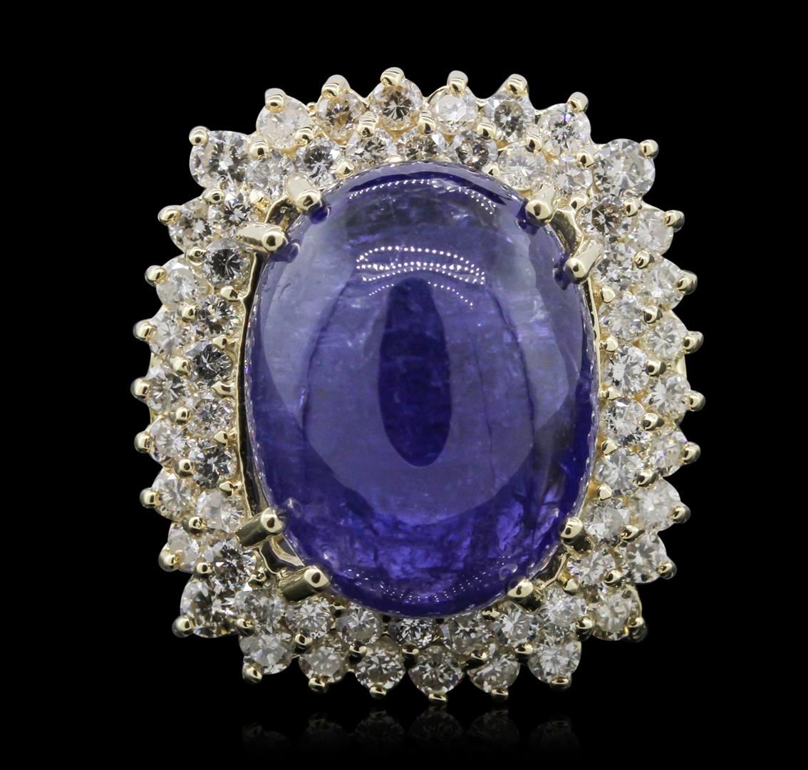 One electronically tested 14KT yellow gold ladies cast tanzanite and diamond ring with a bright polish finish. Condition is new, good workmanship. The featured tanzanite is set within two tiered diamond bezels supported by tapering shoulders, completed by a two and one-half millimeter wide band. Identified with markings of "K14". Containing: One prong set oval cabochon cut natural tanzanite, measuring 18.35 x 14.15 x 7.30mm, 15%. bulge factor, approximate weight of 19.72ct., clarity is heavily included, type I, dark, moderately strong, bluish violet color, (GIA bV 7/4), cut is good. Transmitting light somewhat diffusely, translucent. Naturally occurring internal & external characteristics are present. Colored Stone Grading Report attached. Graded in the setting. Sixty prong set round brilliant cut diamonds, measuring 2.20 - 2.00 x 1.26mm (depth est.) approximate. Total Weight of 60 Stones = 2.13ct. Graded in the setting. Clarity: SI-1 to I-1. Color: I - K. Total Weight of Colored Stones 19.72ct. Total Weight of Diamonds 2.13ct. Total Weight of Ring 15.99 grams. AIG Appraised at $13,045.00.
