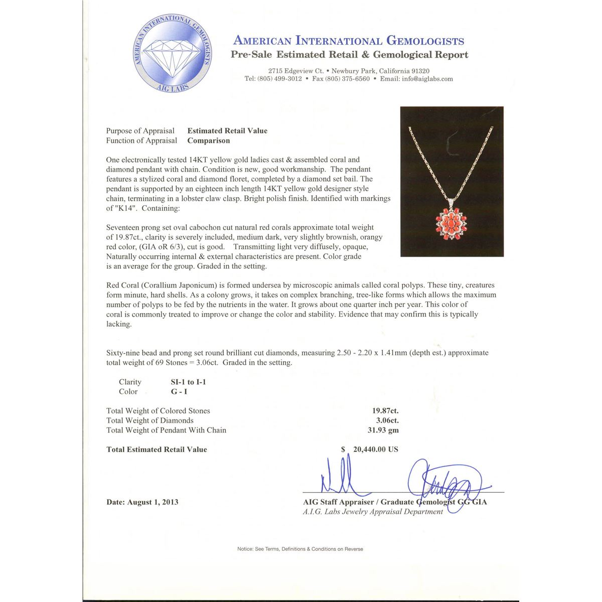 One electronically tested 14KT yellow gold ladies cast & assembled coral and diamond pendant with chain. Condition is new, good workmanship. The pendant features a stylized coral and diamond floret, completed by a diamond set bail. The pendant is supported by an eighteen inch length 14KT yellow gold designer style chain, terminating in a lobster claw clasp. Bright polish finish. Identified with markings of "K14". Containing: Seventeen prong set oval cabochon cut natural red corals approximate total weight of 19.87ct., clarity is severely included, medium dark, very slightly brownish, orangy red color, (GIA oR 6/3), cut is good. Transmitting light very diffusely, opaque, Naturally occurring internal & external characteristics are present. Color grade is an average for the group. Graded in the setting. Red Coral (Corallium Japonicum) is formed undersea by microscopic animals called coral polyps. These tiny, creatures form minute, hard shells. As a colony grows, it takes on complex branching, tree-like forms which allows the maximum number of polyps to be fed by the nutrients in the water. It grows about one quarter inch per year. This color of coral is commonly treated to improve or change the color and stability. Evidence that may confirm this is typically lacking. Sixty-nine bead and prong set round brilliant cut diamonds, measuring 2.50 - 2.20 x 1.41mm (depth est.) approximate total weight of 69 Stones = 3.06ct. Graded in the setting. Clarity SI-1 to I-1. Color G -- I. Total Weight of Colored Stones 19.87ct. Total Weight of Diamonds 3.06et. Total Weight of Pendant With Chain 31.93gm. AIG Appraised at $20,440.00.