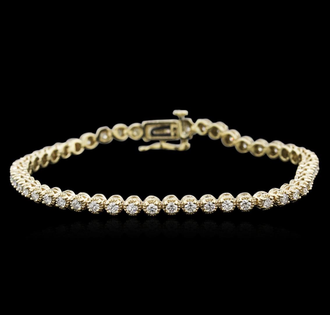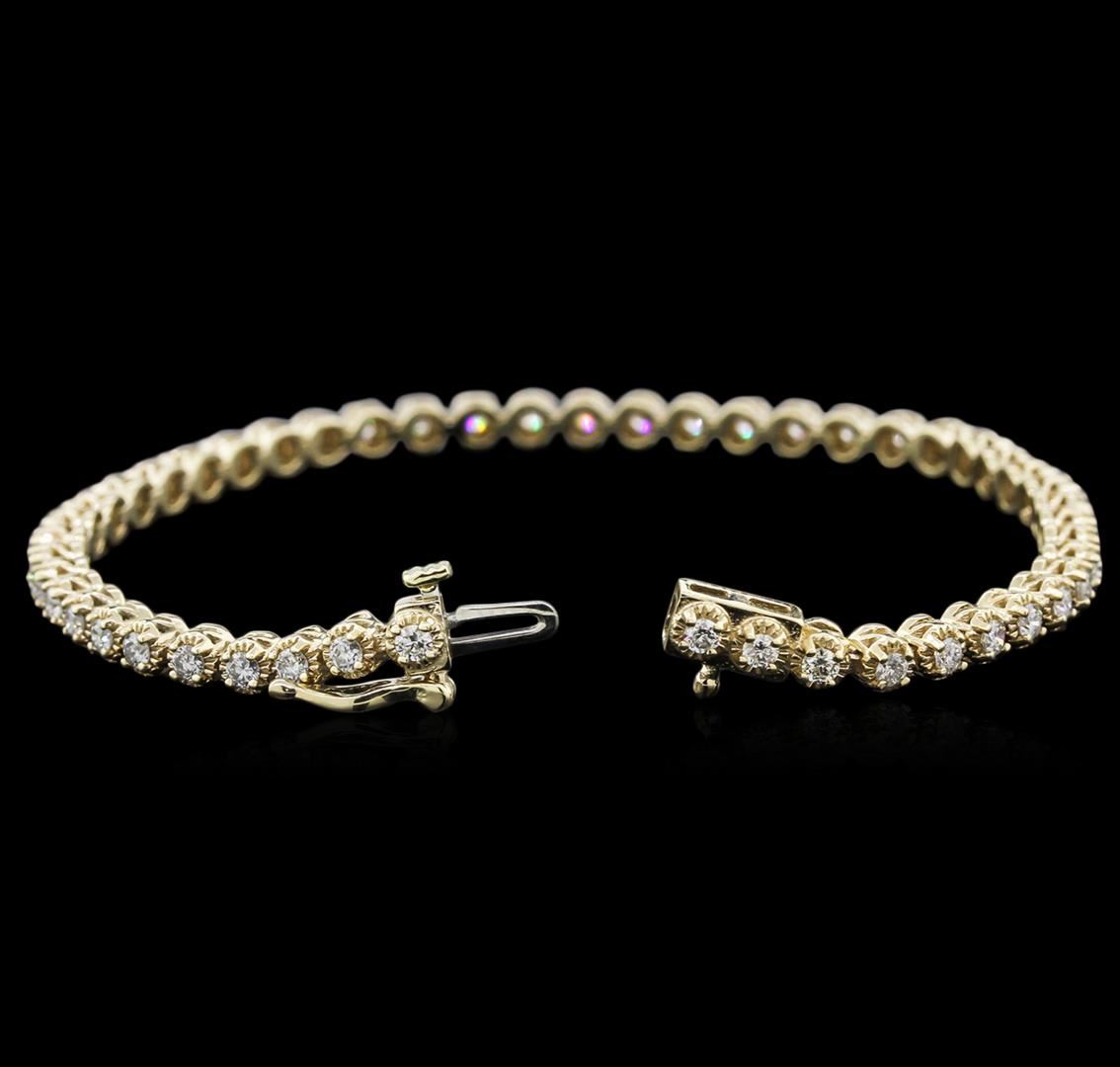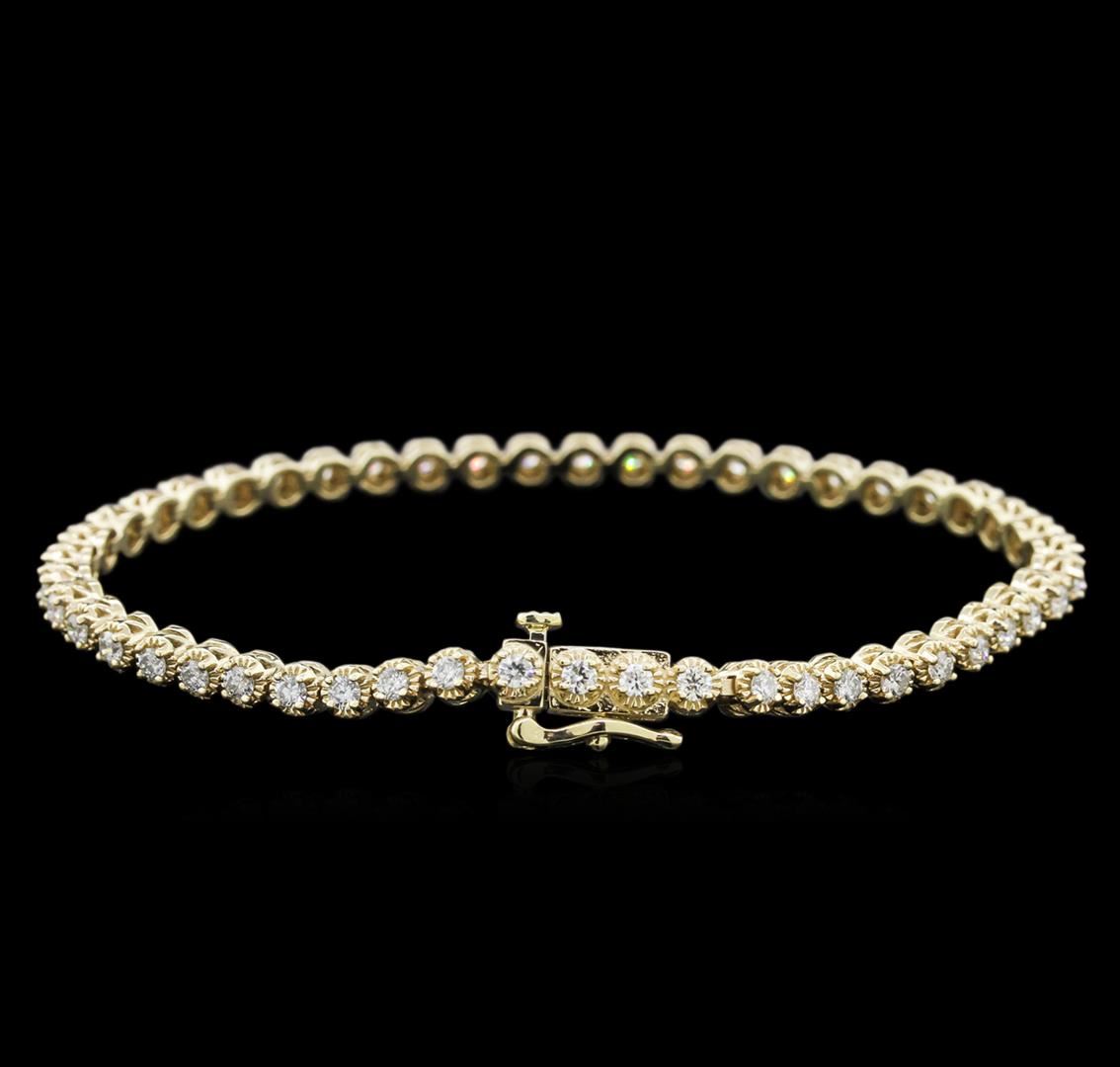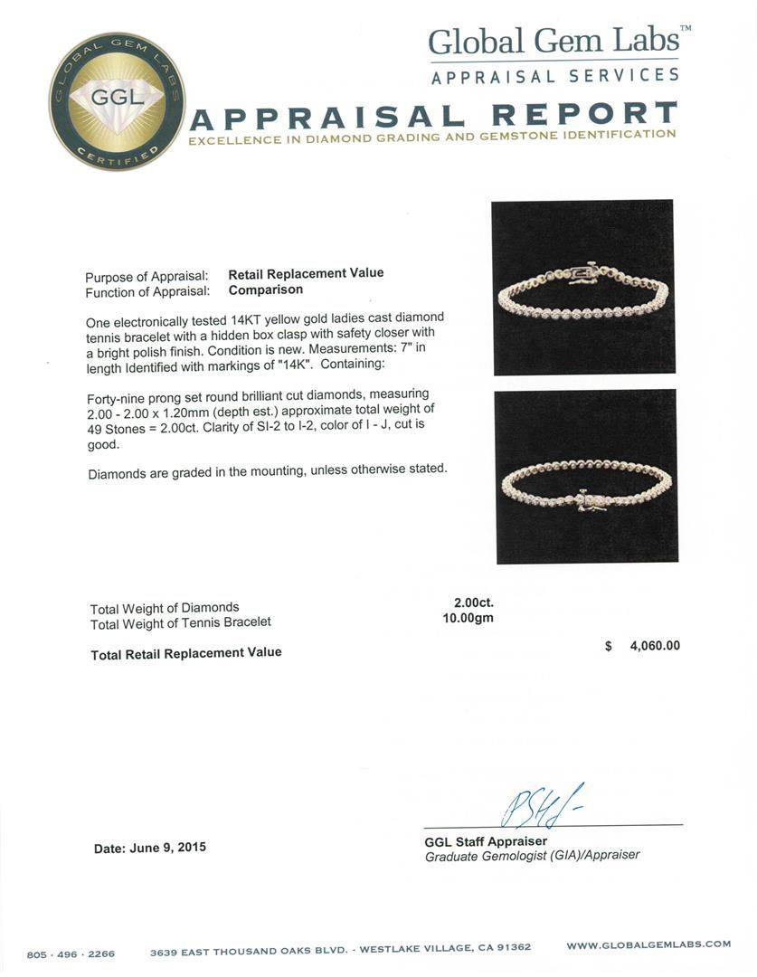 One electronically tested 14KT yellow gold ladies cast diamond tennis bracelet with a hidden box clasp with safety closer with a bright polish finish. Measurements: 7" in length Identified with markings of "14K". Condition is new. Containing: Forty-Nine prong set round brilliant cut diamonds, measuring 2.00 - 2.00 x 1.20mm (depth est.) approximate total weight of 49 Stones = 2.00ct. Clarity: SI-2 to I-2. Color: I - J, Cut is Good. Diamonds are graded in the mounting, unless otherwise stated. Total Weight of Diamonds 2.00ct. Total Weight of Tennis Bracelet 10.00 grams. GGL Appraised at $4,060.00.