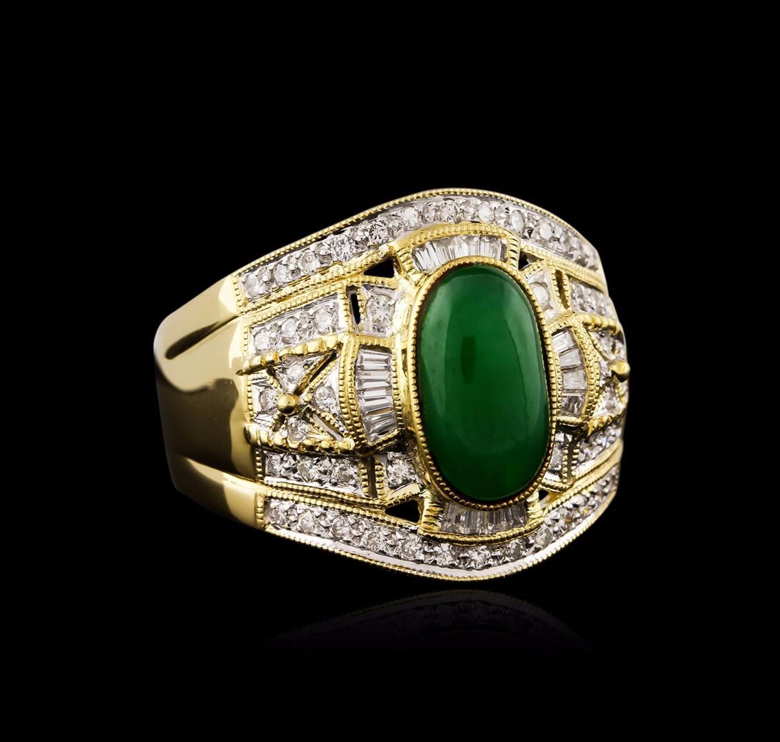 One ring featuring: 14KT yellow gold weighing 10.60 grams containing one jade center weighing 2.00ct and diamonds weighing a total of 1.00ct.