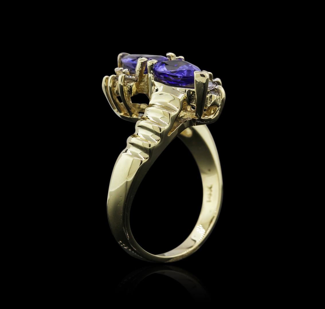 One ring featuring: 14KT yellow gold weighing 5.71 grams containing two tanzanites with a total weight of 2.00ct and diamonds with a total weight of 0.10ct.