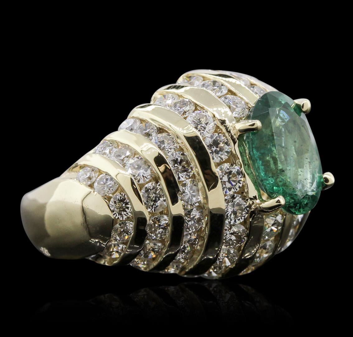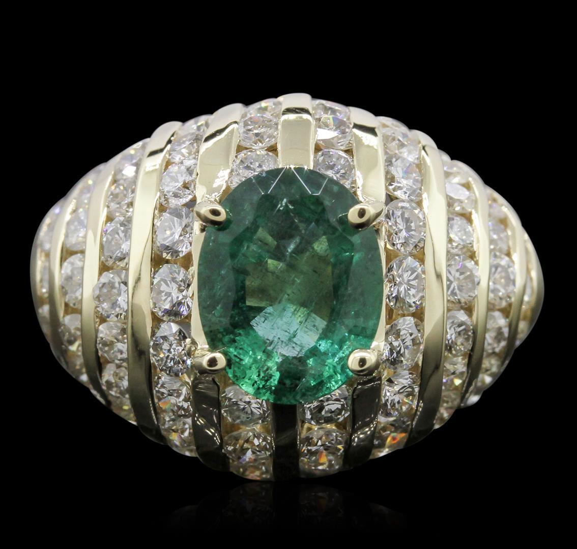 One electronically tested 14KT yellow gold Ladies combination cast & assembled fashion ring with a high polish finish. Condition is new. Identified with markings of "14K". Containing: One prong set oval modified mixed cut natural emerald, measuring 9.95 x 8.08 x 4.60mm, approximate weight of 2.03ct., clarity is heavily included, type III, medium, very slightly grayish, very slightly bluish green color, (GIA vslbG 5/3), cut is good. Colored gemstones are presumed to have been subjected to commonly used and possible undetectable color/clarity enhancement processes. Sixty-Six prong set round brilliant cut diamonds, measuring 2.50 - 1.50 x 1.20mm (depth est.) approximate total weight of 66 Stones = 1.93ct. Clarity of SI-1 to I-1, Color of I - J, Cut is Good. Total Weight of Colored Stones 2.03ct. Total Weight of Diamonds 1.93ct. Total Weight of Ring 12.70 grams. GGL Appraised.