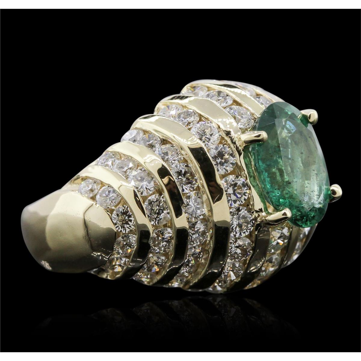 One electronically tested 14KT yellow gold Ladies combination cast & assembled fashion ring with a high polish finish. Condition is new. Identified with markings of "14K". Containing: One prong set oval modified mixed cut natural emerald, measuring 9.95 x 8.08 x 4.60mm, approximate weight of 2.03ct., clarity is heavily included, type III, medium, very slightly grayish, very slightly bluish green color, (GIA vslbG 5/3), cut is good. Colored gemstones are presumed to have been subjected to commonly used and possible undetectable color/clarity enhancement processes. Sixty-Six prong set round brilliant cut diamonds, measuring 2.50 - 1.50 x 1.20mm (depth est.) approximate total weight of 66 Stones = 1.93ct. Clarity of SI-1 to I-1, Color of I - J, Cut is Good. Total Weight of Colored Stones 2.03ct. Total Weight of Diamonds 1.93ct. Total Weight of Ring 12.70 grams. GGL Appraised at $12,415.00.