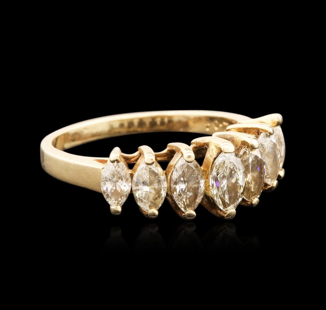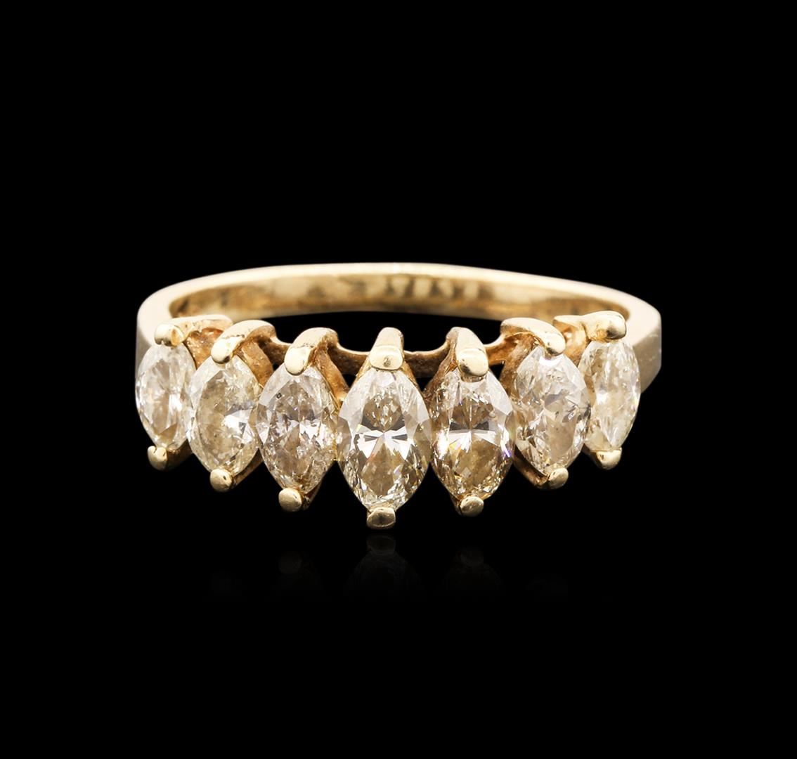 One electronically tested 14KT yellow gold ladies cast diamond ring with a bright polish finish. The ring features a tapering seven diamond ribbon, completed by a two millimeter wide band. Identified with markings of "14K". Condition is good. Containing: Seven prong set marquise shaped cut diamonds (depth est.) approximate total weight of 7 Stones = 2.04ct. Graded in the setting. Clarity: SI-2 to I-1. Color: H - J. Total Weight of Diamonds 2.04ct. Total Weight of Ring 4.17 grams. AIG Appraised at $6,035.00.