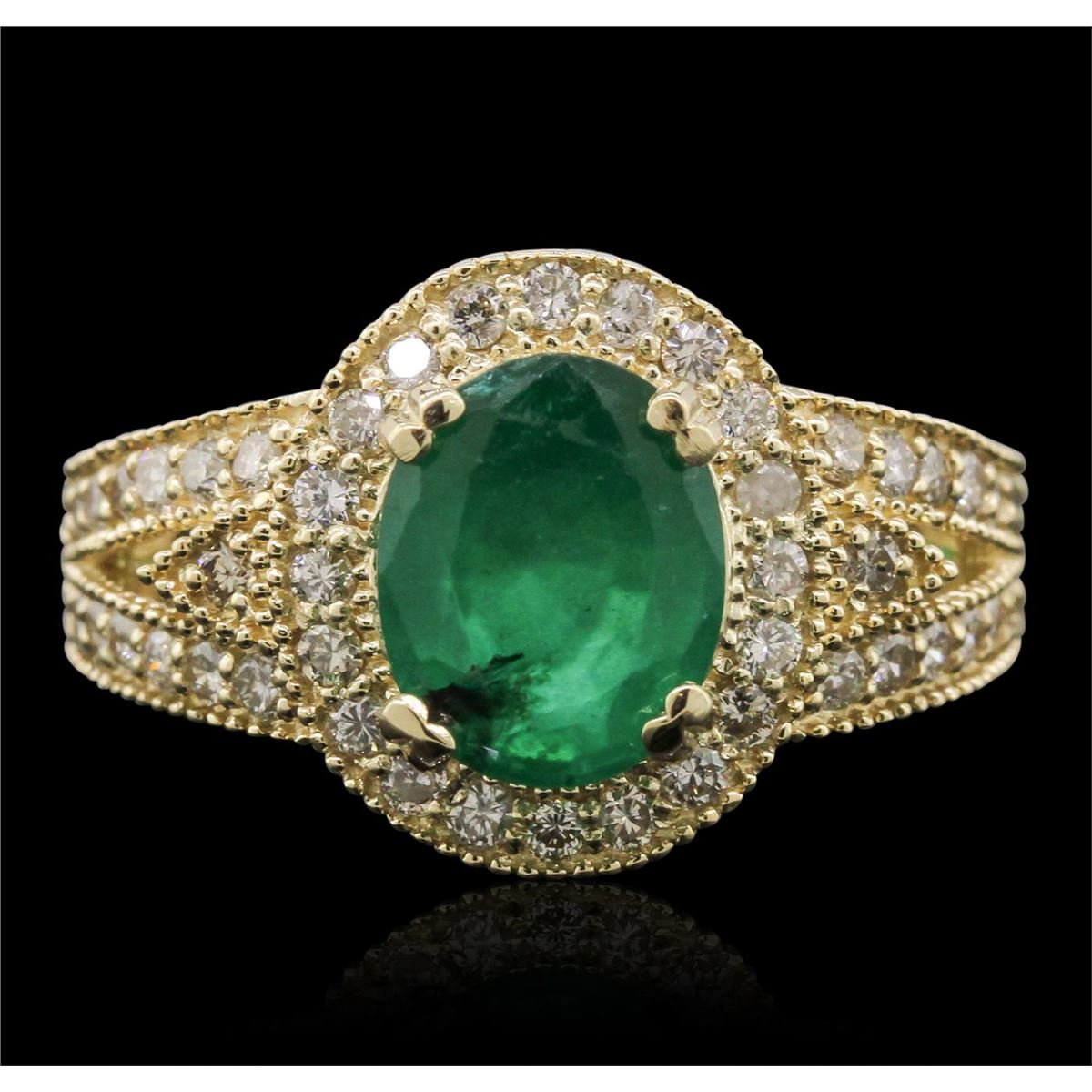 One electronically tested 14KT yellow gold Ladies combination cast & assembled ring with a bright polish finish. Condition is new. Identified with markings of "K14". Containing: One prong set oval modified brilliant cut natural emerald, measuring 9.60 x 7.60 x 4.94mm, approximate weight of 2.05ct., clarity is heavily included, type III, medium, moderately strong, green color, (GIA G 5/4), cut is good. Colored gemstones are presumed to have been subjected to commonly used color/clarity enhancement processes. Fifty-One prong set round brilliant cut diamonds, measuring 1.50 - 1.50 x 0.90mm (depth est.) approximate. Total Weight of 51 Stones = 0.63ct. Clarity: I-1 to I-2. Color: I - J, Cut is Good. Total Weight of Colored Stones 2.05ct. Total Weight of Diamonds 0.63ct. Total Weight of Ring 6.90 grams. GGL Appraised at $7,495.00.