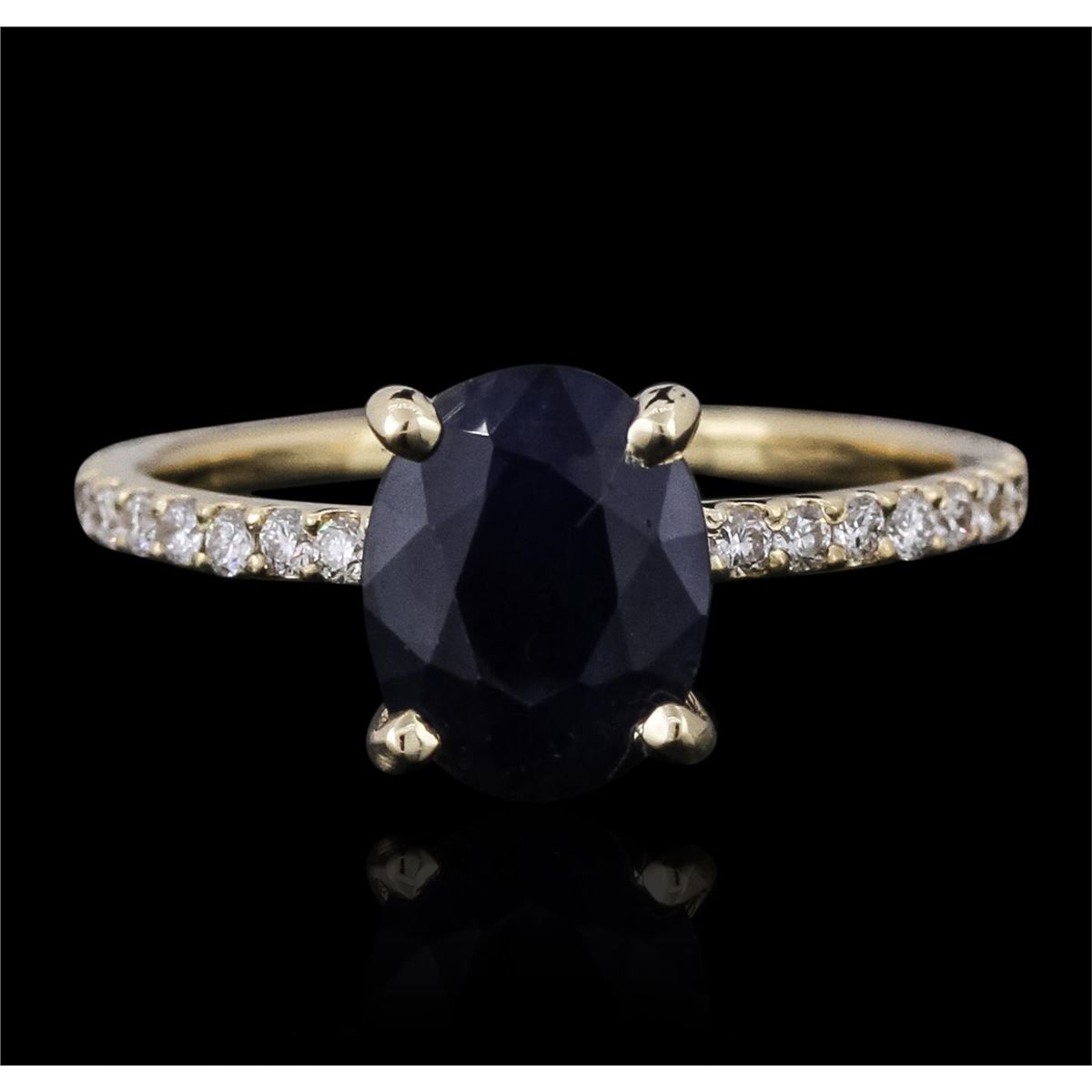 One electronically tested 14KT yellow gold ladies combination cast & assembled ring with a bright polish finish. Condition is new. Identified with markings of "14K". Containing: One prong set oval modified brilliant cut natural blue sapphire, measuring 9.00 x 7.00 x 4.01mm, approximate weight of 2.05ct., clarity is heavily included, type II, medium dark, moderately strong, blue color, (GIA B 6/4), cut is good. Twenty-Eight prong set round brilliant cut diamonds, measuring 1.40 - 1.40 x 0.84mm (depth est.) approximate total weight of 28 Stones = 0.28ct. Clarity: SI-1 to SI-2. Color: H - I, Cut is Good. Colored gemstones are presumed to have been subjected to commonly used enhancement processes. All diamonds and colored gemstones are graded in the mounting, unless otherwise stated. Total Weight of Colored Stones 2.05ct. Total Weight of Diamonds 0.28ct. Total Weight of Ring 2.40 grams. GGL Appraised at $3,645.00.