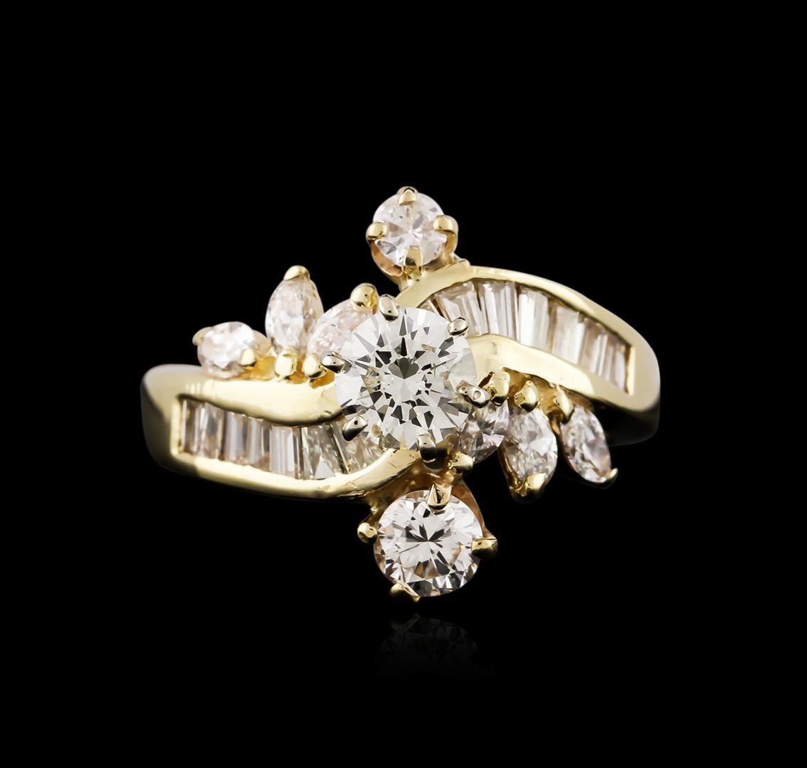 One electronically tested 14KT yellow gold ladies cast diamond engagement ring with a bright polish finish. Identified with markings of "14K". Condition is new. Containing: One prong set round brilliant cut diamond, measuring 5.30 - 5.30 x 3.18mm (depth est.) approximate weight of 0.55ct. Clarity: I-1. Color: K, Cut is Good. Two prong set round brilliant cut diamonds, measuring 4.00. - 2.50 x 1.95mm (depth est.) approximate total weight of 2 Stones = 0.25ct. Clarity: SI-1 to I-1. Color: J - K, Cut is Good. Sixteen channel set baguette cut (tapered) diamonds, measuring from 2.00. x 1.50 x 1.28mm (depth est.) to 3.00. x 2.00. x 1.70mm (depth est.) approximate total weight of 16 Stones = 0.95ct. Clarity: SI-2 to I-1. Color: J - K. Six prong set marquise shaped cut diamonds, measuring 3.50 x 2.00. x 1.26mm (depth est.) approximate total weight of 6 Stones = 0.31ct. Clarity: SI-1. Color: I - J. All diamonds are graded in the mounting, unless otherwise stated. Total Weight of Diamonds 2.06ct. Total Weight of Engagement Ring 6.60 grams. GGL Appraised at $5,040.00.