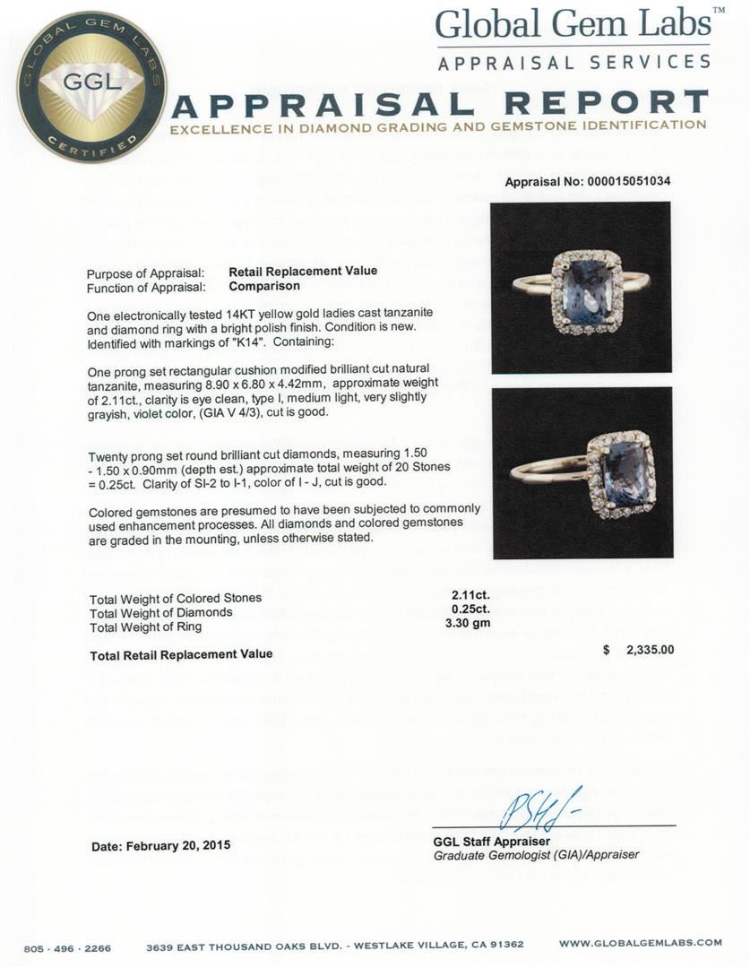 One electronically tested 14KT yellow gold ladies cast tanzanite and diamond ring with a bright polish finish. Identified with markings of "K14". Condition is new. Containing: One prong set rectangular cushion modified brilliant cut natural tanzanite, measuring 8.90 x 6.80 x 4.42mm, approximate weight of 2.11ct., clarity is eye clean, type I, medium light, very slightly grayish, violet color, (GIA V 4/3), cut is good. Twenty prong set round brilliant cut diamonds, measuring 1.50 - 1.50 x 0.90mm (depth est.) approximate total weight of 20 Stones = 0.25ct. Clarity: SI-2 to I-1. Color: I - J, Cut is Good. Colored gemstones are presumed to have been subjected to commonly used enhancement processes. All diamonds and colored gemstones are graded in the mounting, unless otherwise stated. Total Weight of Colored Stones 2.11ct. Total Weight of Diamonds 0.25ct. Total Weight of Ring 3.30 grams. GGL Appraised at $2,335.00.