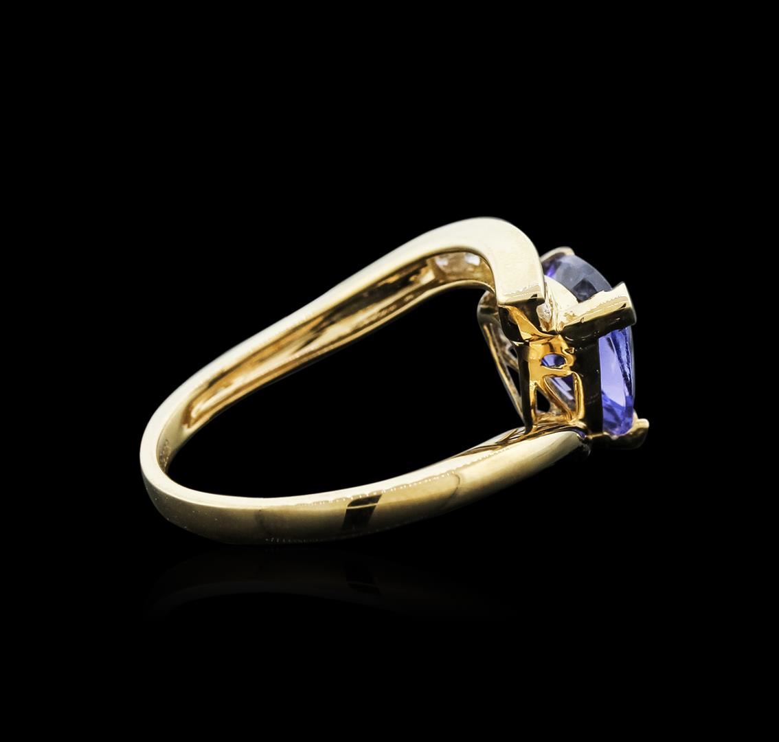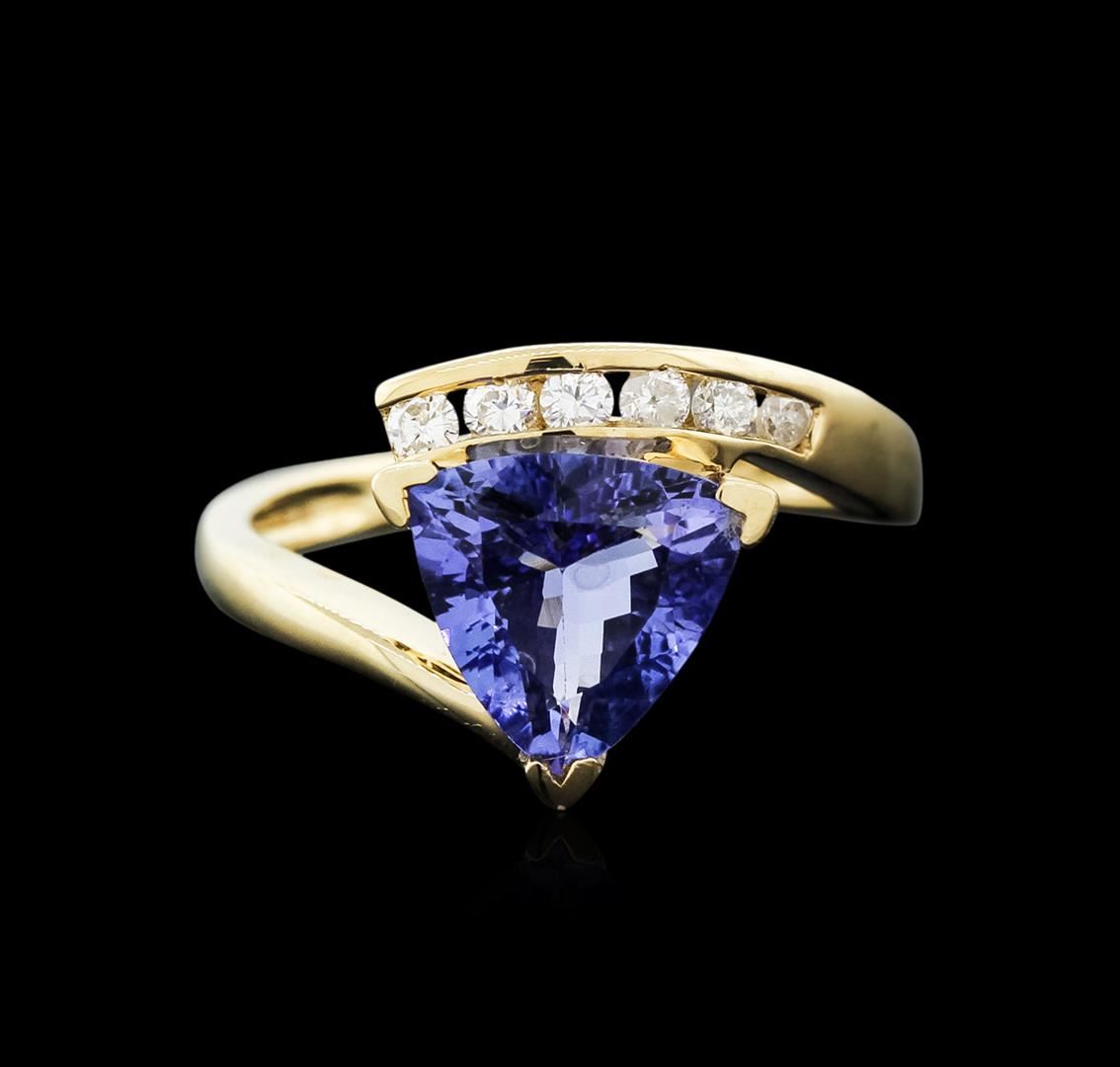 One electronically tested 14KT yellow gold ladies cast tanzanite and diamond ring with a flat shank with a bright polish finish. Trademark is Orianne. Identified with markings of "14K". Condition is new. Containing: One prong set triangle modified brilliant cut natural tanzanite, measuring 8.75 x 8.70 x 4.61mm, approximate weight of 2.12ct., clarity is eye clean, type I, medium, very slightly grayish, violet color, (GIA V 5/3), cut is good. Six prong set round brilliant cut diamonds, measuring 2.00 - 2.00 x 1.20mm (depth est.) approximate total weight of 6 Stones = 0.18ct. Clarity: SI-1 to SI-2. Color: I - J, Cut is Good. All diamonds and colored gemstones are graded in the mounting, unless otherwise stated. Colored gemstones are presumed to have been subjected to commonly used enhancement processes. Total Weight of Colored Stones 2.12ct. Total Weight of Diamonds 0.18ct. Total Weight of Ring 3.50 grams. GGL Appraised at $2,610.00.