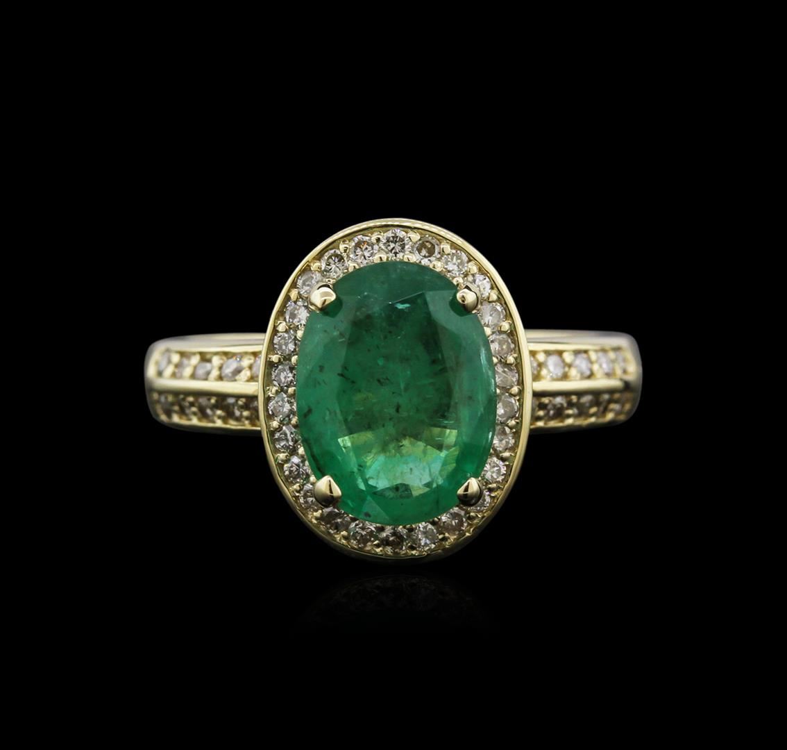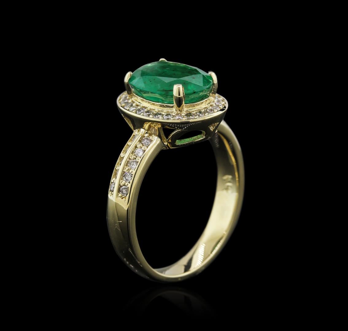 One electronically tested 14KT yellow gold ladies cast emerald and diamond ring with a bright polish finish. Identified with markings of "K14". Condition is new. Containing: One prong set oval modified brilliant cut natural emerald, measuring 10.63 x 8.03 x 4.43mm, approximate weight of 2.16ct., clarity is moderately included, type III, medium, very slightly grayish, very slightly bluish green color, (GIA vslbG 5/3), cut is good. Forty-Six prong set round brilliant cut diamonds, measuring 1.30 - 1.30 x 0.78mm (depth est.) approximate total weight of 46 Stones = 0.37ct. Clarity: I-1 to I-2. Color: J - K, Cut is Good. Diamonds and colored gemstones are graded in the mounting, unless otherwise stated. Colored gemstones are presumed to have been subjected to commonly used enhancement processes. Total Weight of Colored Stones 2.16ct. Total Weight of Diamonds 0.37ct. Total Weight of Ring 6.40 grams. GGL Appraised at $4,685.00.