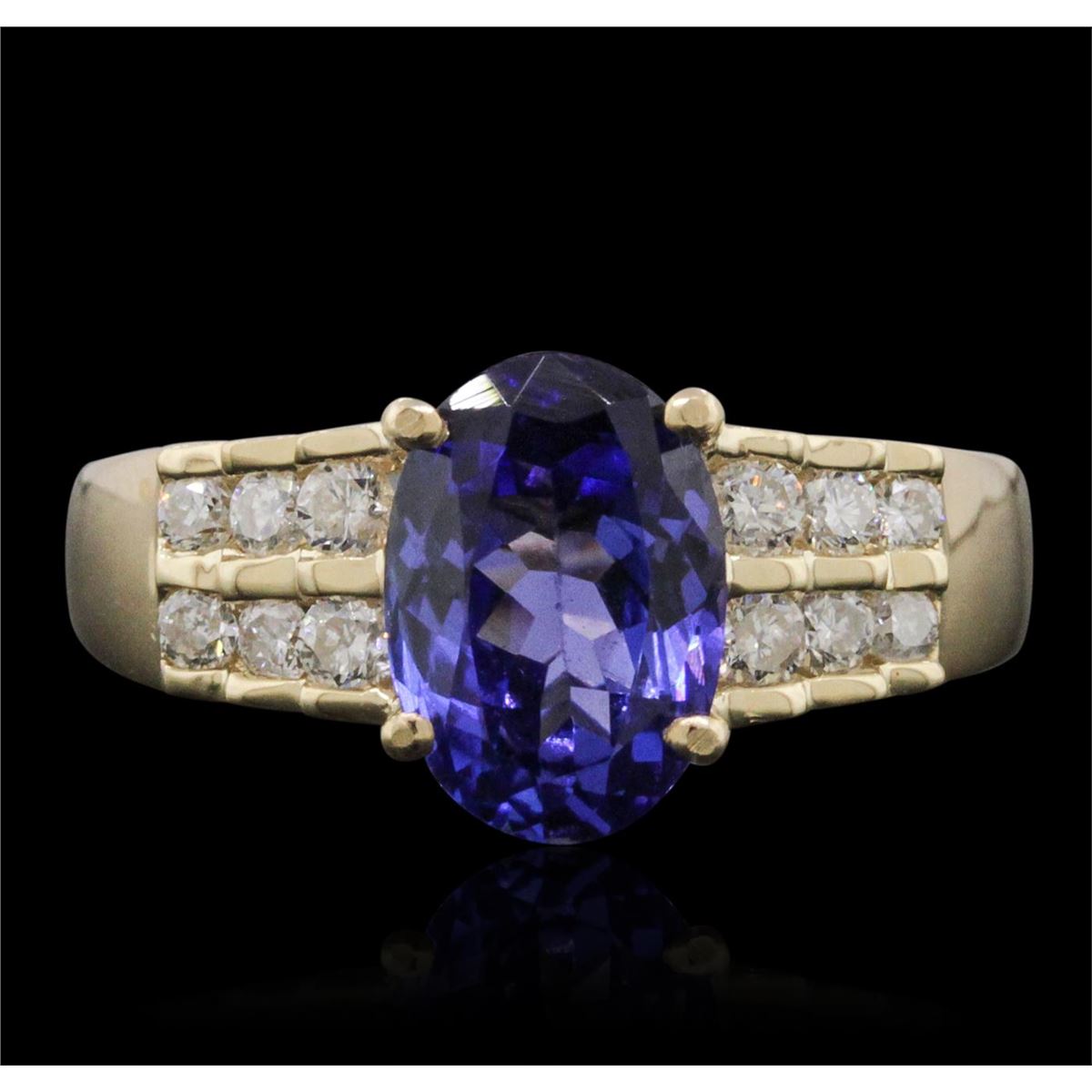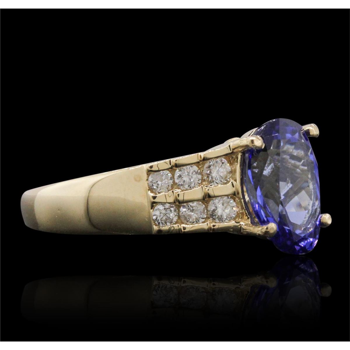 One electronically tested 14KT yellow gold ladies cast tanzanite and diamond ring with a bright polish finish. The featured tanzanite is supported by diamond set shoulders, completed by a two millimeter wide band Trademark is Orianne. Identified with markings of "14K". Condition is new, good workmanship. Containing: One prong set oval brilliant cut natural tanzanite, measuring 9.90 x 6.80 x 4.45mm, 6% bulge factor, approximate weight of 2.20ct., clarity is eye clean, type I, medium dark, moderately strong, violetish blue color, (GIA vB 6/4), cut is good. Transmitting light with no distortion, transparent. Graded in the setting.Tanzanite is a very rare gemstone that is only found in the country of Tanzania. Originally discovered in 1967. Tiffany & Company, named the stone Tanzanite. It is found in the Usumburu Mountains that border the Umba Valley of northern Tanzania. Tanzanite occurs in gray, brown, violet, blue, reddish-purple, & green. The gem is interesting because of its exceptional pleochroism. Rotated in different directions a tanzanite will exhibit multiple changes of color. Tanzanite has a low tolerance to ultrasonic cleaning, and should not be cleaned using this method.Twelve channel set round brilliant cut diamonds, measuring 2.20 - 2.00 x 1.26mm (depth est.) approximate total weight of 12 Stones = 0.50ct. Graded in the setting. Clarity: SI-2 to I-1. Color: G - I. Total Weight of Colored Stones 2.20ct. Total Weight of Diamonds 0.50ct. Total Weight of Ring 3.97 grams. AIG Appraised at $7,275.00.
