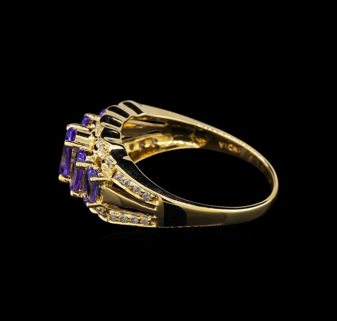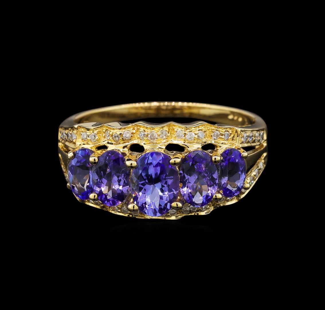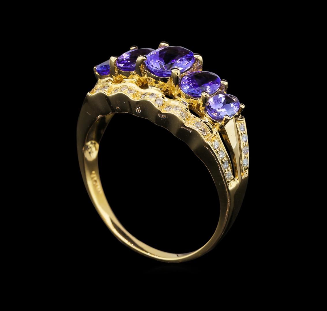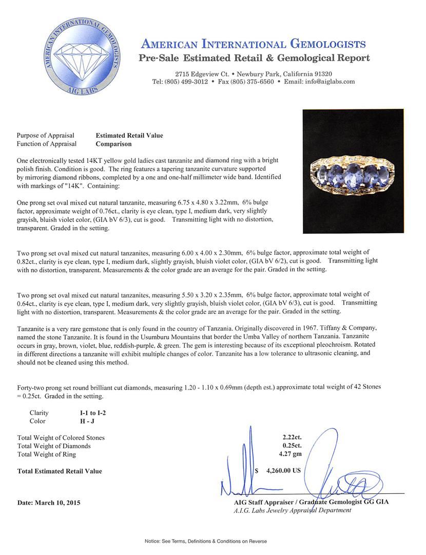 One electronically tested 14KT yellow gold ladies cast tanzanite and diamond ring with a bright polish finish. The ring features a tapering tanzanite curvature supported by mirroring diamond ribbons, completed by a one and one-half millimeter wide band. Identified with markings of "14K". Condition is good. Containing: One prong set oval mixed cut natural tanzanite, measuring 6.75 x 4.80 x 3.22mm, 6% bulge factor, approximate weight of 0.76ct., clarity is eye clean, type I, medium dark, very slightly grayish, bluish violet color, (GIA bV 6/3), cut is good. Transmitting light with no distortion, transparent. Graded in the setting. Two prong set oval mixed cut natural tanzanites, measuring 6.00 x 4.00 x 2.30mm, 6% bulge factor, approximate total weight of 0.82ct., clarity is eye clean, type I, medium dark, slightly grayish, bluish violet color, (GIA bV 6/2), cut is good. Transmitting light with no distortion, transparent. Measurements & the color grade are an average for the pair. Graded in the setting. Two prong set oval mixed cut natural tanzanites, measuring 5.50 x 3.20 x 2.35mm, 6% bulge factor, approximate total weight of 0.64ct., clarity is eye clean, type I, medium dark, very slightly grayish, bluish violet color, (GIA bV 6/3), cut is good. Transmitting light with no distortion, transparent. Measurements & the color grade are an average for the pair. Graded in the setting. Tanzanite is a very rare gemstone that is only found in the country of Tanzania. Originally discovered in 1967. Tiffany & Company, named the stone Tanzanite. It is found in the Usumburu Mountains that border the Umba Valley of northern Tanzania. Tanzanite occurs in gray, brown, violet, blue, reddish-purple, & green. The gem is interesting because of its exceptional pleochroism. Rotated in different directions a tanzanite will exhibit multiple changes of color. Tanzanite has a low tolerance to ultrasonic cleaning, and should not be cleaned using this method. Forty-Two prong set round brilliant cut diamonds, measuring 1.20 - 1.10 x 0.69mm (depth est.) approximate total weight of 42 Stones = 0.25ct. Graded in the setting. Clarity: I-1 to I-2. Color: H - J. Total Weight of Colored Stones 2.22ct. Total Weight of Diamonds 0.25ct. Total Weight of Ring 4.27 grams. AIG Appraised at $4,260.00.
