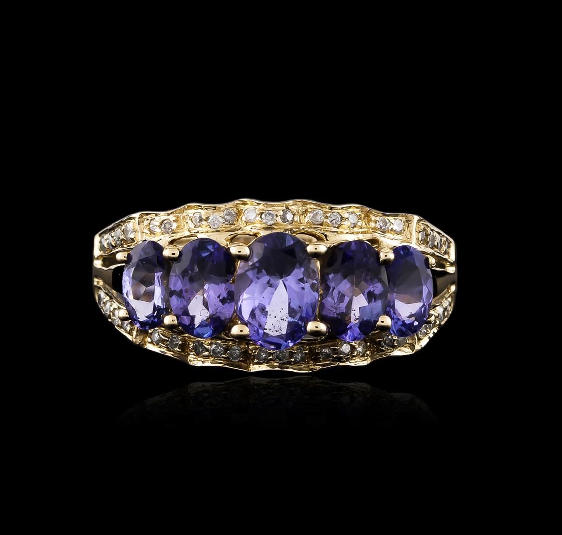 One electronically tested 14KT yellow gold ladies cast tanzanite and diamond ring with a bright polish finish. The ring features a tapering tanzanite curvature supported by mirroring diamond ribbons, completed by a one and one-half millimeter wide band. Identified with markings of "14K". Condition is good. Containing: One prong set oval mixed cut natural tanzanite, measuring 6.75 x 4.80 x 3.22mm, 6% bulge factor, approximate weight of 0.76ct., clarity is eye clean, type I, medium dark, very slightly grayish, bluish violet color, (GIA bV 6/3), cut is good. Transmitting light with no distortion, transparent. Graded in the setting. Two prong set oval mixed cut natural tanzanites, measuring 6.00 x 4.00 x 2.30mm, 6% bulge factor, approximate total weight of 0.82ct., clarity is eye clean, type I, medium dark, slightly grayish, bluish violet color, (GIA bV 6/2), cut is good. Transmitting light with no distortion, transparent. Measurements & the color grade are an average for the pair. Graded in the setting. Two prong set oval mixed cut natural tanzanites, measuring 5.50 x 3.20 x 2.35mm, 6% bulge factor, approximate total weight of 0.64ct., clarity is eye clean, type I, medium dark, very slightly grayish, bluish violet color, (GIA bV 6/3), cut is good. Transmitting light with no distortion, transparent. Measurements & the color grade are an average for the pair. Graded in the setting. Tanzanite is a very rare gemstone that is only found in the country of Tanzania. Originally discovered in 1967. Tiffany & Company, named the stone Tanzanite. It is found in the Usumburu Mountains that border the Umba Valley of northern Tanzania. Tanzanite occurs in gray, brown, violet, blue, reddish-purple, & green. The gem is interesting because of its exceptional pleochroism. Rotated in different directions a tanzanite will exhibit multiple changes of color. Tanzanite has a low tolerance to ultrasonic cleaning, and should not be cleaned using this method. Forty-Two prong set round brilliant cut diamonds, measuring 1.20 - 1.10 x 0.69mm (depth est.) approximate total weight of 42 Stones = 0.25ct. Graded in the setting. Clarity: I-1 to I-2. Color: H - J. Total Weight of Colored Stones 2.22ct. Total Weight of Diamonds 0.25ct. Total Weight of Ring 4.27 grams. AIG Appraised at $4,260.00.