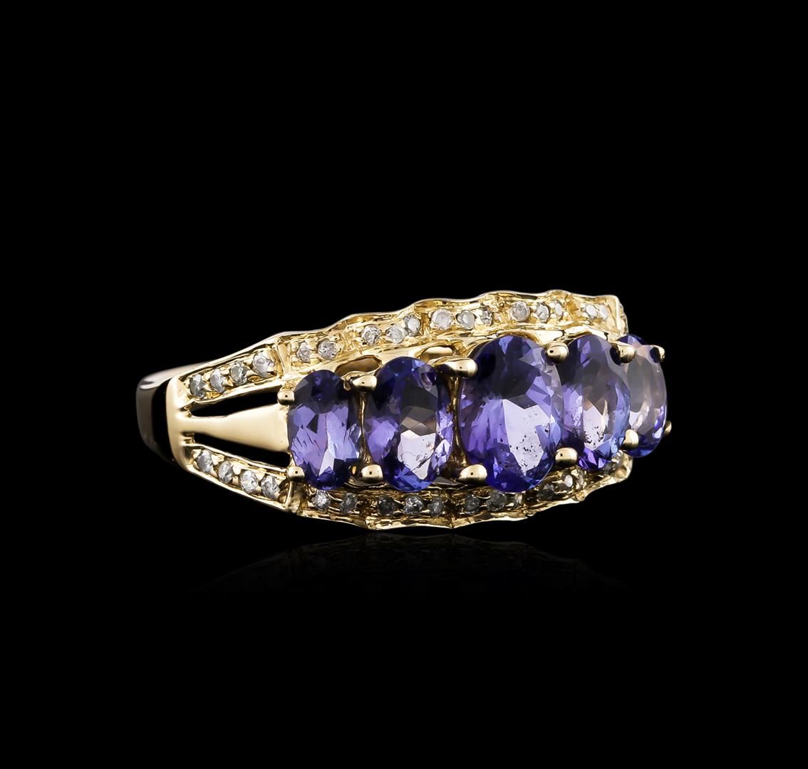 One electronically tested 14KT yellow gold ladies cast tanzanite and diamond ring with a bright polish finish. The ring features a tapering tanzanite curvature supported by mirroring diamond ribbons, completed by a one and one-half millimeter wide band. Identified with markings of "14K". Condition is good. Containing: One prong set oval mixed cut natural tanzanite, measuring 6.75 x 4.80 x 3.22mm, 6% bulge factor, approximate weight of 0.76ct., clarity is eye clean, type I, medium dark, very slightly grayish, bluish violet color, (GIA bV 6/3), cut is good. Transmitting light with no distortion, transparent. Graded in the setting. Two prong set oval mixed cut natural tanzanites, measuring 6.00 x 4.00 x 2.30mm, 6% bulge factor, approximate total weight of 0.82ct., clarity is eye clean, type I, medium dark, slightly grayish, bluish violet color, (GIA bV 6/2), cut is good. Transmitting light with no distortion, transparent. Measurements & the color grade are an average for the pair. Graded in the setting. Two prong set oval mixed cut natural tanzanites, measuring 5.50 x 3.20 x 2.35mm, 6% bulge factor, approximate total weight of 0.64ct., clarity is eye clean, type I, medium dark, very slightly grayish, bluish violet color, (GIA bV 6/3), cut is good. Transmitting light with no distortion, transparent. Measurements & the color grade are an average for the pair. Graded in the setting. Tanzanite is a very rare gemstone that is only found in the country of Tanzania. Originally discovered in 1967. Tiffany & Company, named the stone Tanzanite. It is found in the Usumburu Mountains that border the Umba Valley of northern Tanzania. Tanzanite occurs in gray, brown, violet, blue, reddish-purple, & green. The gem is interesting because of its exceptional pleochroism. Rotated in different directions a tanzanite will exhibit multiple changes of color. Tanzanite has a low tolerance to ultrasonic cleaning, and should not be cleaned using this method. Forty-Two prong set round brilliant cut diamonds, measuring 1.20 - 1.10 x 0.69mm (depth est.) approximate total weight of 42 Stones = 0.25ct. Graded in the setting. Clarity: I-1 to I-2. Color: H - J. Total Weight of Colored Stones 2.22ct. Total Weight of Diamonds 0.25ct. Total Weight of Ring 4.27 grams. AIG Appraised at $4,260.00.