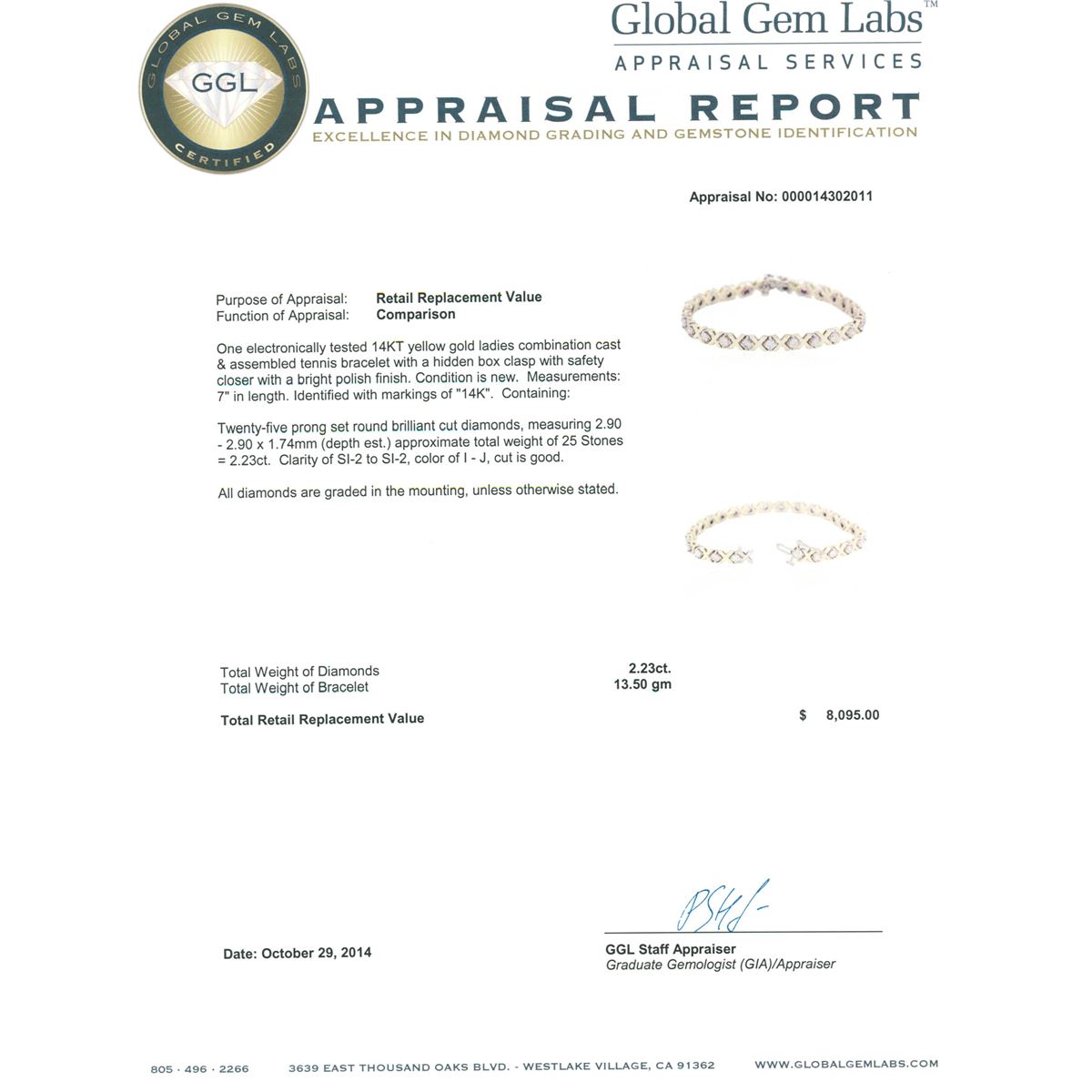 One electronically tested 14KT yellow gold ladies combination cast & assembled tennis bracelet with a hidden box clasp with safety closer with a bright polish finish. Measurements: 7 in length. Identified with markings of 14K. Condition is new. Containing: Twenty-Five prong set round brilliant cut diamonds, measuring 2.90 - 2.90 x 1.74mm (depth est.) approximate total weight of 25 Stones = 2.23ct. Clarity: SI-2 to SI-2. Color: I - J, Cut is Good. All diamonds are graded in the mounting, unless otherwise stated. Total Weight of Diamonds 2.23ct. Total Weight of Bracelet 13.50 grams. GGL Appraised at $8,095.00.