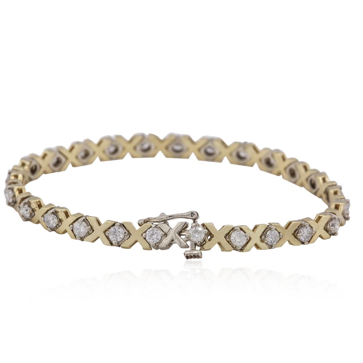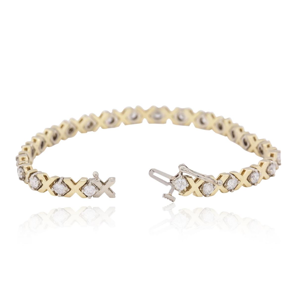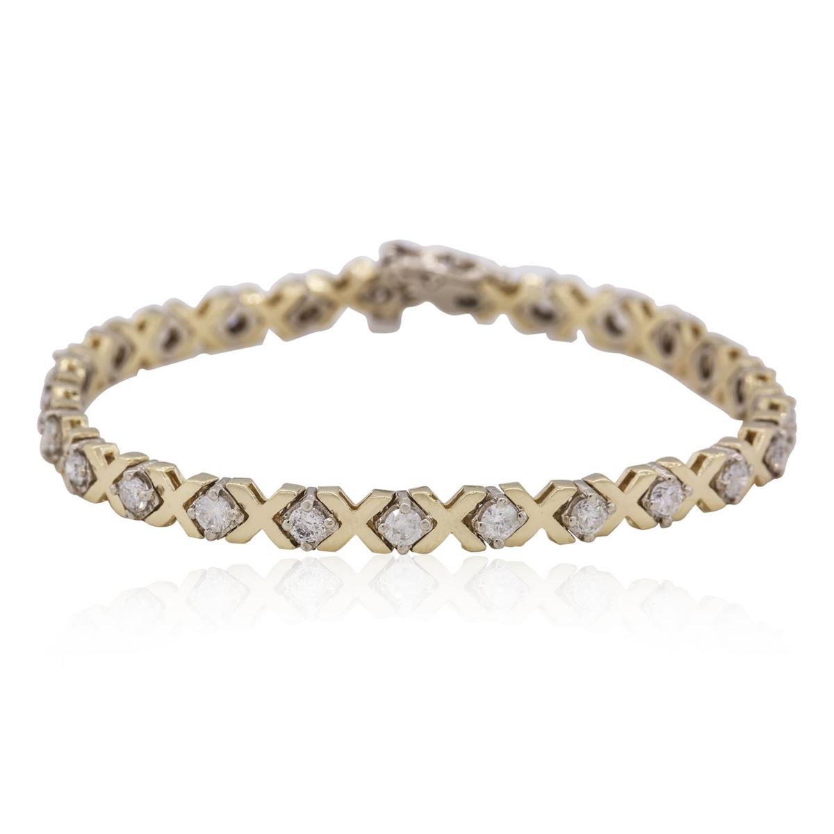 One electronically tested 14KT yellow gold ladies combination cast & assembled tennis bracelet with a hidden box clasp with safety closer with a bright polish finish. Measurements: 7 in length. Identified with markings of 14K. Condition is new. Containing: Twenty-Five prong set round brilliant cut diamonds, measuring 2.90 - 2.90 x 1.74mm (depth est.) approximate total weight of 25 Stones = 2.23ct. Clarity: SI-2 to SI-2. Color: I - J, Cut is Good. All diamonds are graded in the mounting, unless otherwise stated. Total Weight of Diamonds 2.23ct. Total Weight of Bracelet 13.50 grams. GGL Appraised at $8,095.00.