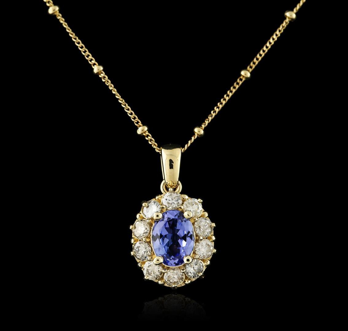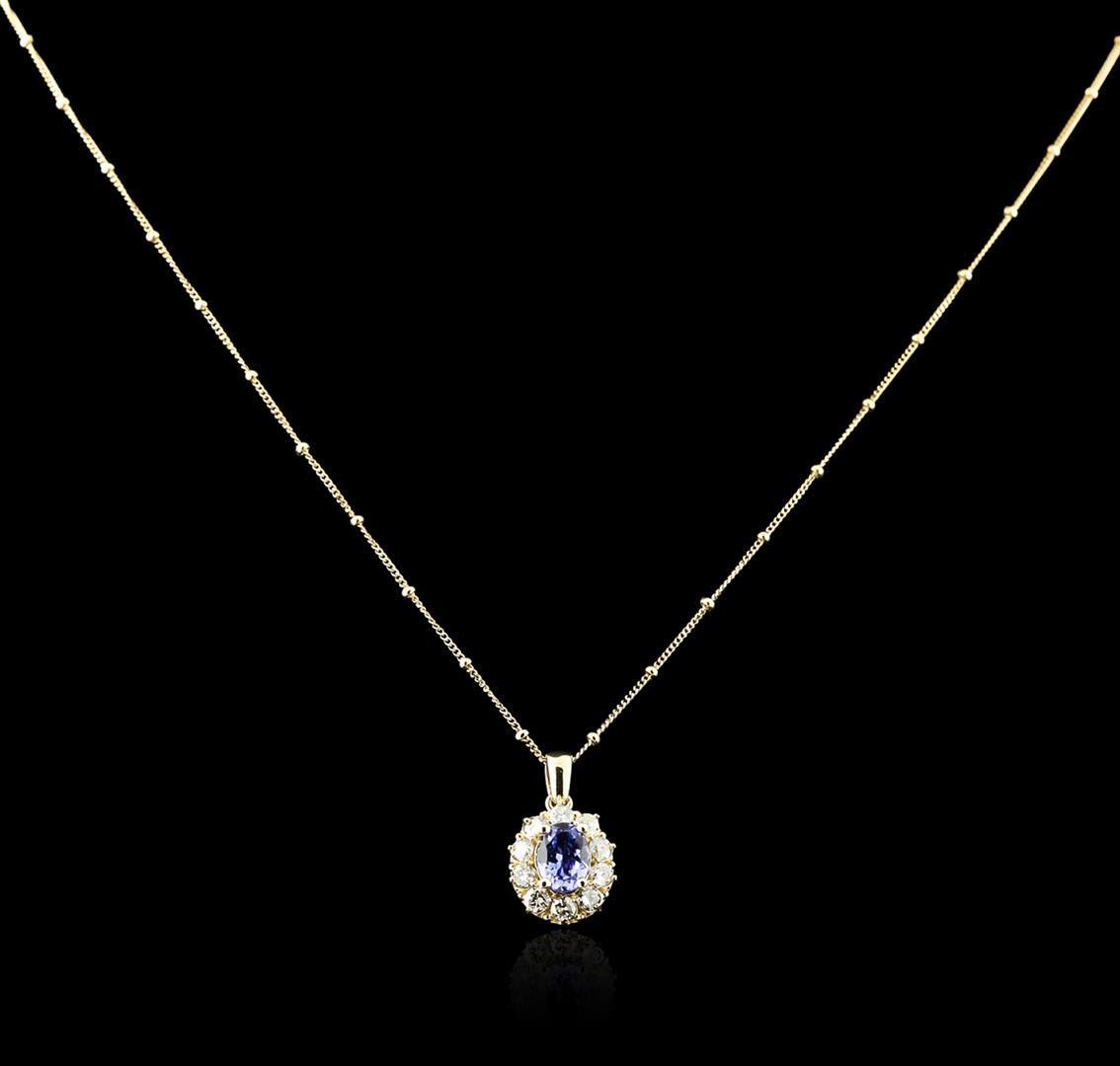 One electronically tested 14KT yellow gold ladies combination cast & assembled tanzanite and diamond pendant & chain 18.0" long, thin curb link with a spring ring clasp with a bright polish finish. Identified with markings of "14K". Condition is new. Containing: One prong set oval modified brilliant cut natural tanzanite, measuring 9.00 x 7.00 x 5.06mm, approximate weight of 2.24ct., clarity is eye clean, type I, medium light, very slightly grayish, violet color, (GIA V 4/3), cut is good. Ten prong set round brilliant cut diamonds, measuring 3.00 - 3.00 x 1.80mm (depth est.) approximate total weight of 10 Stones = 0.99ct. Clarity: SI-2 to I-2. Color: I - J, Cut is Good. Diamonds and colored gemstones are graded in the mounting, unless otherwise stated. Colored gemstones are presumed to have been subjected to commonly used enhancement processes. Total Weight of Colored Stones 2.24ct. Total Weight of Diamonds 0.99ct. Total Weight of Pendant & Chain 5.30 grams. GGL Appraised at $3,060.00.