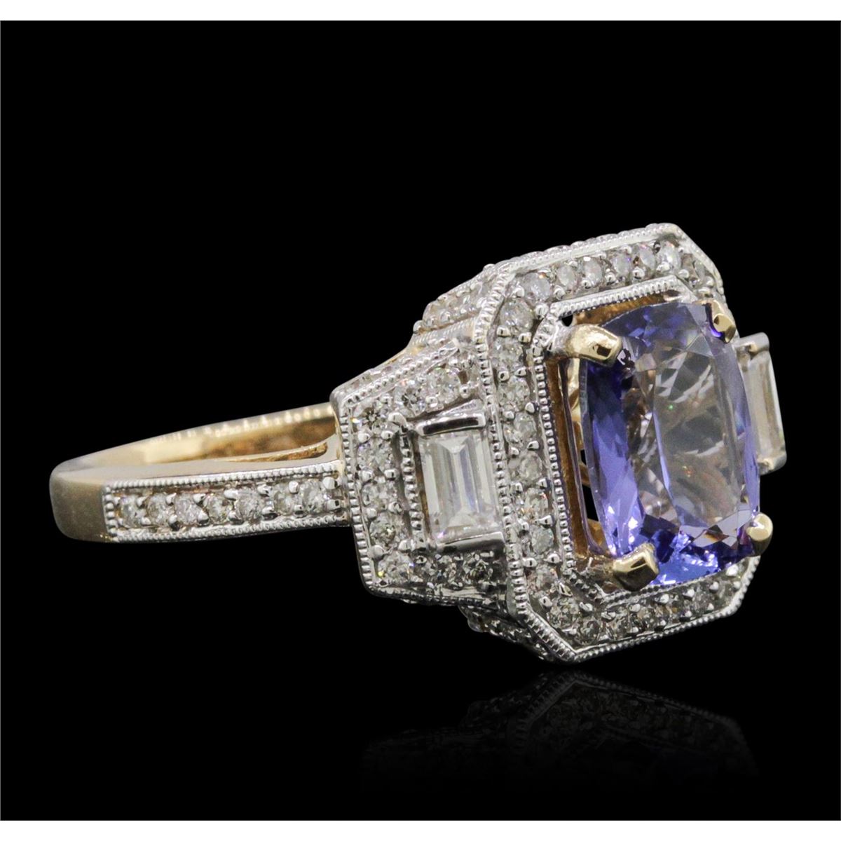 One electronically tested 14KT yellow gold ladies combination cast & assembled tanzanite and diamond ring with a flat shank with a bright polish finish. Identified with markings of "14K". Condition is new. Containing: One prong set rectangular cushion modified brilliant cut natural tanzanite, measuring 8.89 x 7.01 x 4.56mm, approximate weight of 2.24ct., clarity is eye clean, type I, medium, very slightly grayish, violet color, (GIA V 5/3), cut is good. One Hundred prong set round brilliant cut diamonds, measuring 1.00 - 1.00 x 0.60mm (depth est.) approximate total weight of 100 Stones = 0.36ct. Clarity: SI-2 to I-1. Color: I - J, Cut is Good. Two prong set baguette cut diamonds, measuring 3.00 x 2.00 x 1.70mm (depth est.) approximate total weight of 2 Stones = 0.19ct. Clarity: SI-1. Color: I, Cut is Good. Colored gemstones are presumed to have been subjected to commonly used enhancement processes. All diamonds and colored gemstones are graded in the mounting, unless otherwise stated. Total Weight of Colored Stones 2.24ct. Total Weight of Diamonds 0.55ct. Total Weight of Ring 4.90 grams. GGL Appraised at $5,720.00.