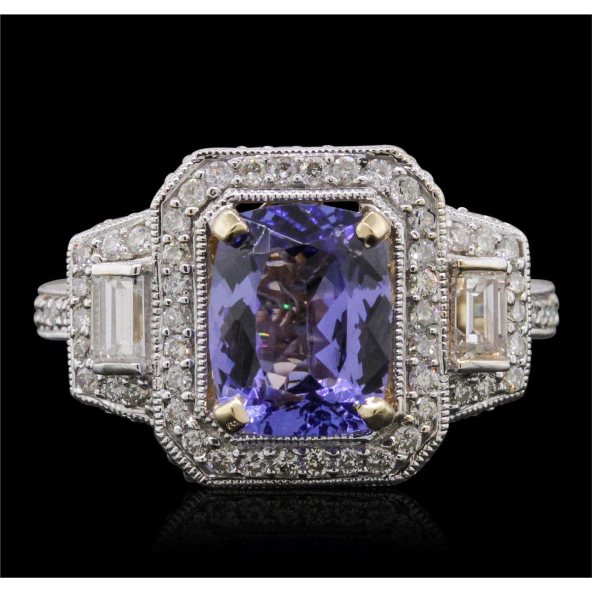 One electronically tested 14KT yellow gold ladies combination cast & assembled tanzanite and diamond ring with a flat shank with a bright polish finish. Identified with markings of "14K". Condition is new. Containing: One prong set rectangular cushion modified brilliant cut natural tanzanite, measuring 8.89 x 7.01 x 4.56mm, approximate weight of 2.24ct., clarity is eye clean, type I, medium, very slightly grayish, violet color, (GIA V 5/3), cut is good. One Hundred prong set round brilliant cut diamonds, measuring 1.00 - 1.00 x 0.60mm (depth est.) approximate total weight of 100 Stones = 0.36ct. Clarity: SI-2 to I-1. Color: I - J, Cut is Good. Two prong set baguette cut diamonds, measuring 3.00 x 2.00 x 1.70mm (depth est.) approximate total weight of 2 Stones = 0.19ct. Clarity: SI-1. Color: I, Cut is Good. Colored gemstones are presumed to have been subjected to commonly used enhancement processes. All diamonds and colored gemstones are graded in the mounting, unless otherwise stated. Total Weight of Colored Stones 2.24ct. Total Weight of Diamonds 0.55ct. Total Weight of Ring 4.90 grams. GGL Appraised at $5,720.00.