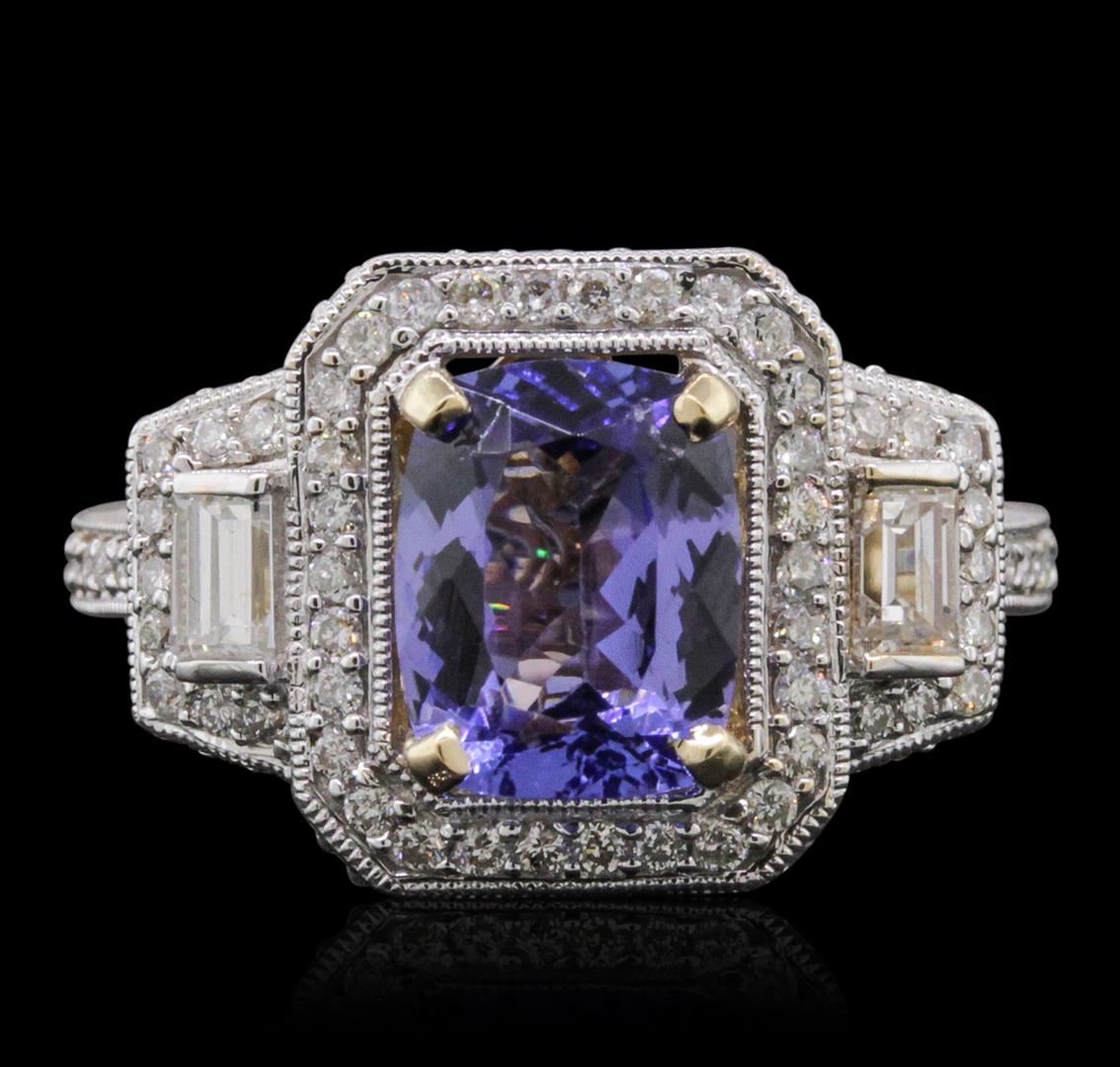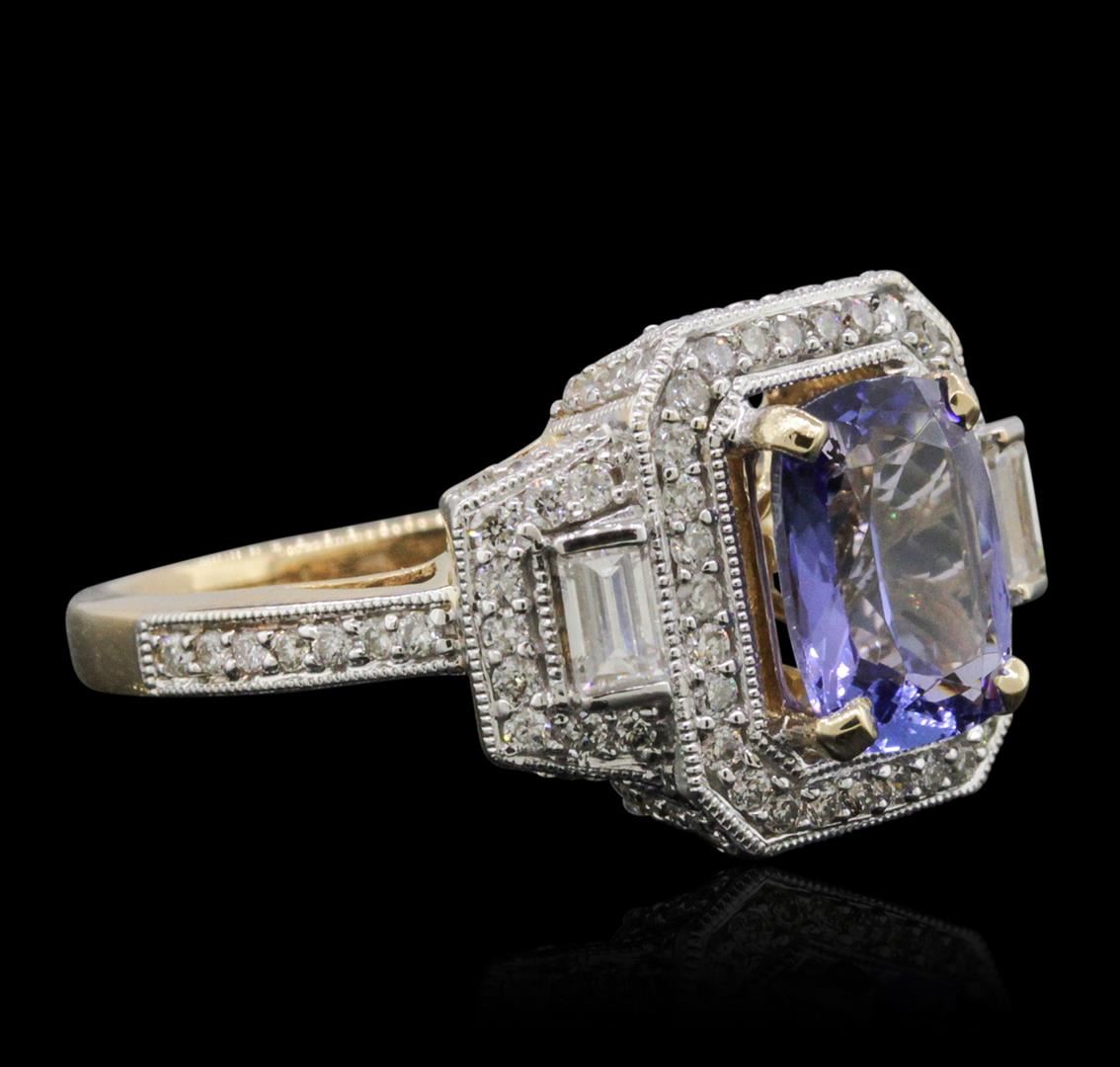 One electronically tested 14KT yellow gold ladies combination cast & assembled tanzanite and diamond ring with a flat shank with a bright polish finish. Identified with markings of "14K". Condition is new. Containing: One prong set rectangular cushion modified brilliant cut natural tanzanite, measuring 8.89 x 7.01 x 4.56mm, approximate weight of 2.24ct., clarity is eye clean, type I, medium, very slightly grayish, violet color, (GIA V 5/3), cut is good. One Hundred prong set round brilliant cut diamonds, measuring 1.00 - 1.00 x 0.60mm (depth est.) approximate total weight of 100 Stones = 0.36ct. Clarity: SI-2 to I-1. Color: I - J, Cut is Good. Two prong set baguette cut diamonds, measuring 3.00 x 2.00 x 1.70mm (depth est.) approximate total weight of 2 Stones = 0.19ct. Clarity: SI-1. Color: I, Cut is Good. Colored gemstones are presumed to have been subjected to commonly used enhancement processes. All diamonds and colored gemstones are graded in the mounting, unless otherwise stated. Total Weight of Colored Stones 2.24ct. Total Weight of Diamonds 0.55ct. Total Weight of Ring 4.90 grams. GGL Appraised at $5,720.00.