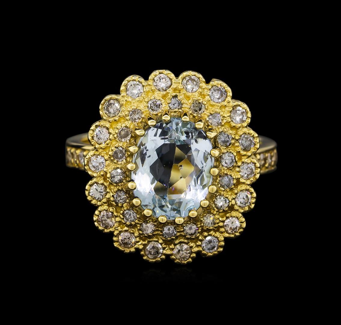 One electronically tested 14KT yellow gold ladies cast aquamarine and diamond ring. Condition is new, good workmanship. The featured aquamarine is set within a two tiered diamond lattice gallery, supported by diamond set shoulders and completed by a three millimeter wide band. Identified with markings of "K14". Containing: One prong set oval mixed cut natural aquamarine, measuring 9.80 x 7.80 x 5.00mm, 8%. bulge factor, approximate weight of 2.27ct., clarity is eye clean, type I, medium light, very slightly grayish, blue color, (GIA B 4/3), cut is good. Transmitting light with no distortion, transparent. Refractive index testing results of 1.56 to 1.57. This is a conclusive result for Aquamarine (Beryl). Graded in the setting. Forty-Eight bead & bezel set round brilliant cut diamonds, measuring 1.70 - 1.50 x 0.96mm (depth est.) approximate. Total Weight of 48 Stones = 0.81ct. Graded in the setting. Clarity: SI-2 to I-2. Color: G - I. Total Weight of Colored Stones 2.27ct. Total Weight of Diamonds 0.81ct. Total Weight of Ring 7.70 grams. AIG Appraised at $4,565.00.