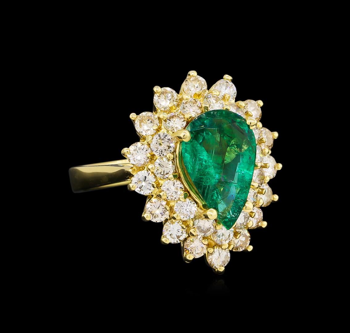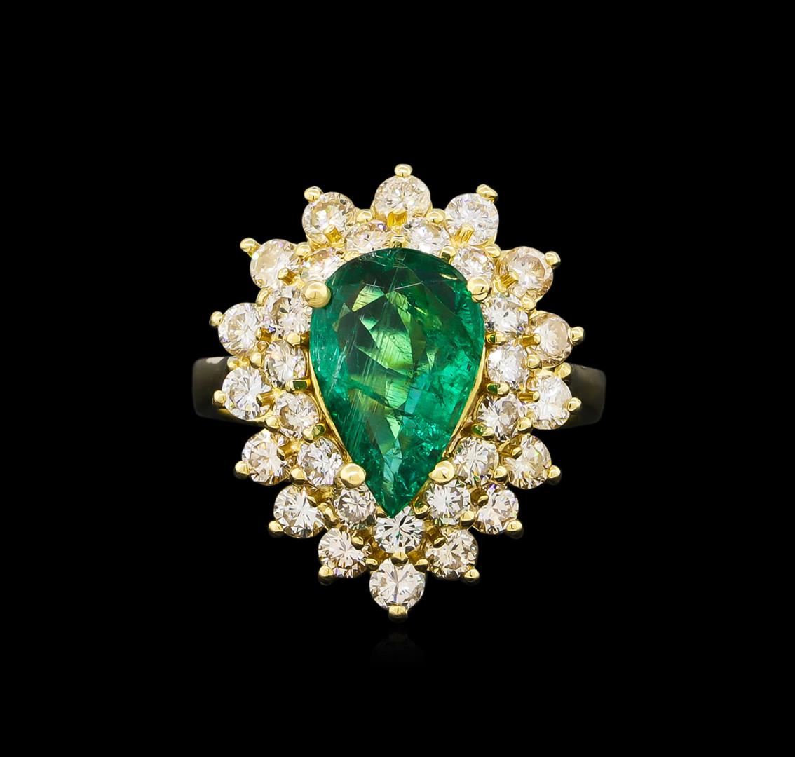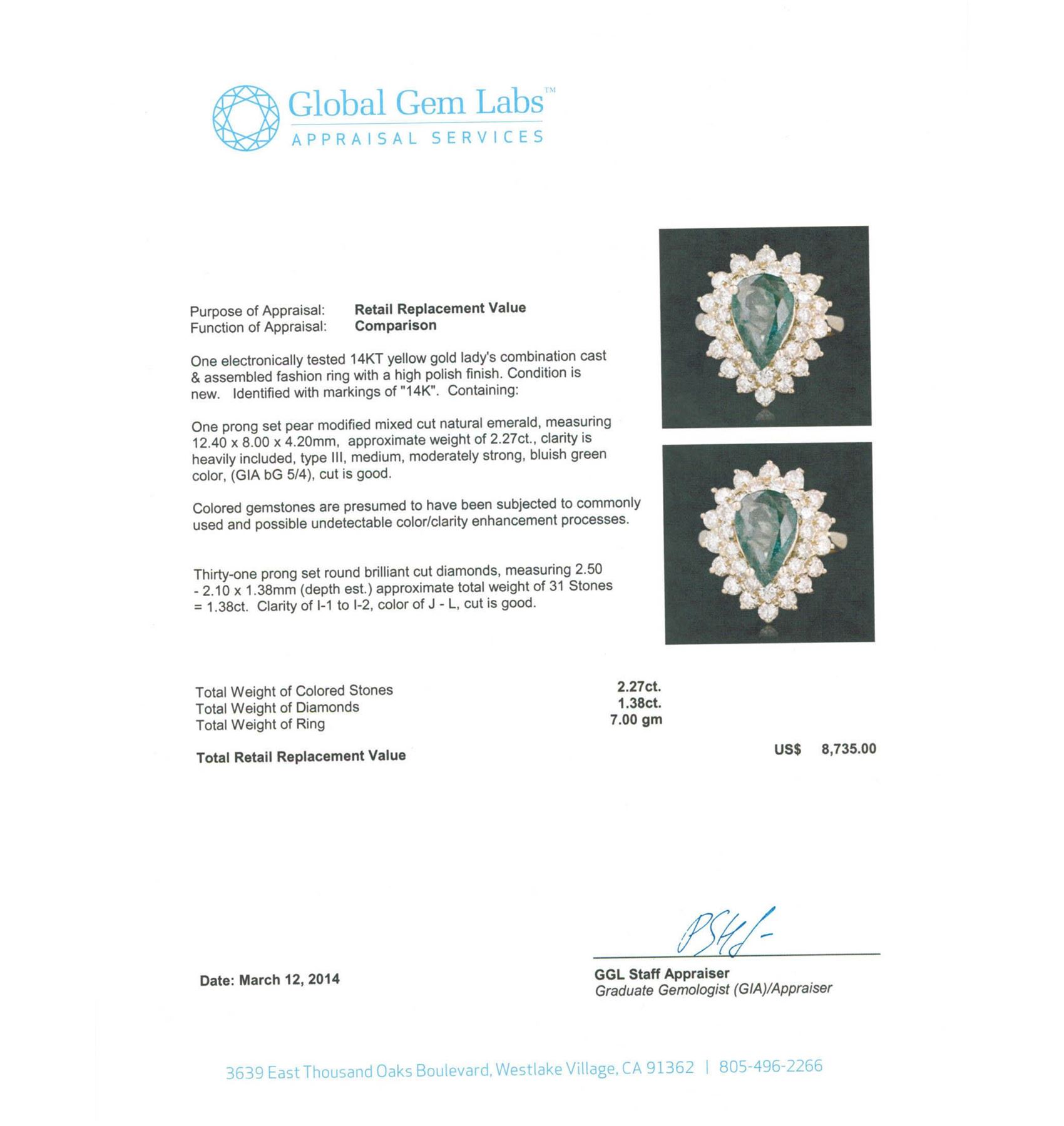 One electronically tested 14KT yellow gold Ladies combination cast & assembled fashion ring with a high polish finish. Condition is new. Identified with markings of "14K". Containing: One prong set pear modified mixed cut natural emerald, measuring 12.40 x 8.00 x 4.20mm, approximate weight of 2.27ct., clarity is heavily included, type III, medium, moderately strong, bluish green color, (GIA bG 5/4), cut is good. Colored gemstones are presumed to have been subjected to commonly used and possible undetectable color/clarity enhancement processes. Thirty-One prong set round brilliant cut diamonds, measuring 2.50 - 2.10 x 1.38mm (depth est.) approximate total weight of 31 Stones = 1.38ct. Clarity of I-1 to I-2, Color of J - L, Cut is Good. Total Weight of Colored Stones 2.27ct. Total Weight of Diamonds 1.38ct. Total Weight of Ring 7.00 grams. GGL Appraised at $8,735.00.