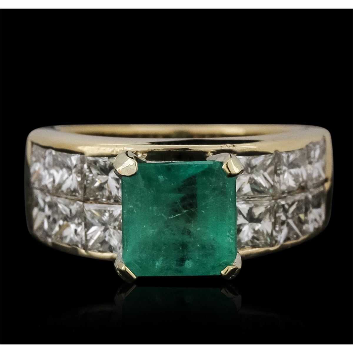 One electronically tested 14KT yellow gold ladies combination cast & assembled emerald and diamond ring with a flat shank with a bright polish finish. Condition is very good. Containing: One prong set emerald standard step cut natural emerald, measuring 7.36 x 7.36 x 5.70mm, approximate weight of 2.27ct., clarity is moderately included, type III, medium light, very slightly grayish, very slightly bluish green color, (GIA vslbG 4/3), cut is good. Twelve invisible set princess cut diamonds, measuring 3.00 x 3.00 x 2.25mm (depth est.) approximate total weight of 12 Stones = 1.99ct. Clarity: SI-1 to SI-2. Color: J, Cut is Good. Colored gemstones are presumed to have been subjected to commonly used enhancement processes. All diamonds and colored gemstones are graded in the mounting, unless otherwise stated. Total Weight of Colored Stones 2.27ct. Total Weight of Diamonds 1.99ct. Total Weight of Ring 7.70 grams. GGL Appraised at $10,690.00.