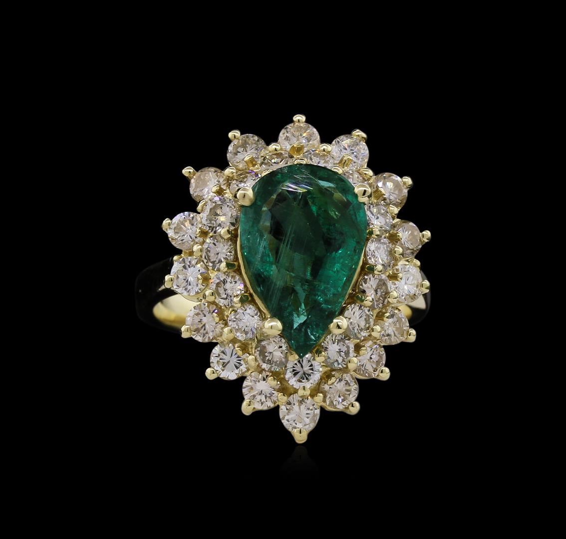 One electronically tested 14KT yellow gold Ladies combination cast & assembled fashion ring with a high polish finish. Condition is new. Identified with markings of "14K". Containing: One prong set pear modified mixed cut natural emerald, measuring 12.40 x 8.00 x 4.20mm, approximate weight of 2.27ct., clarity is heavily included, type III, medium, moderately strong, bluish green color, (GIA bG 5/4), cut is good. Colored gemstones are presumed to have been subjected to commonly used and possible undetectable color/clarity enhancement processes. Thirty-One prong set round brilliant cut diamonds, measuring 2.50 - 2.10 x 1.38mm (depth est.) approximate total weight of 31 Stones = 1.38ct. Clarity of I-1 to I-2, Color of J - L, Cut is Good. Total Weight of Colored Stones 2.27ct. Total Weight of Diamonds 1.38ct. Total Weight of Ring 7.00 grams. GGL Appraised at $8,735.00.