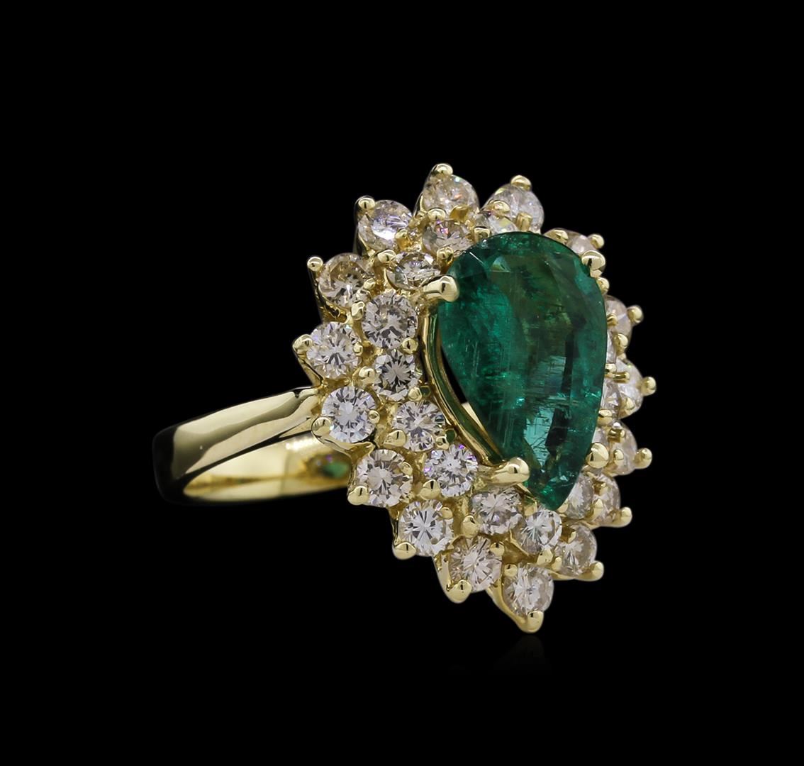 One electronically tested 14KT yellow gold Ladies combination cast & assembled fashion ring with a high polish finish. Condition is new. Identified with markings of "14K". Containing: One prong set pear modified mixed cut natural emerald, measuring 12.40 x 8.00 x 4.20mm, approximate weight of 2.27ct., clarity is heavily included, type III, medium, moderately strong, bluish green color, (GIA bG 5/4), cut is good. Colored gemstones are presumed to have been subjected to commonly used and possible undetectable color/clarity enhancement processes. Thirty-One prong set round brilliant cut diamonds, measuring 2.50 - 2.10 x 1.38mm (depth est.) approximate total weight of 31 Stones = 1.38ct. Clarity of I-1 to I-2, Color of J - L, Cut is Good. Total Weight of Colored Stones 2.27ct. Total Weight of Diamonds 1.38ct. Total Weight of Ring 7.00 grams. GGL Appraised at $8,735.00.