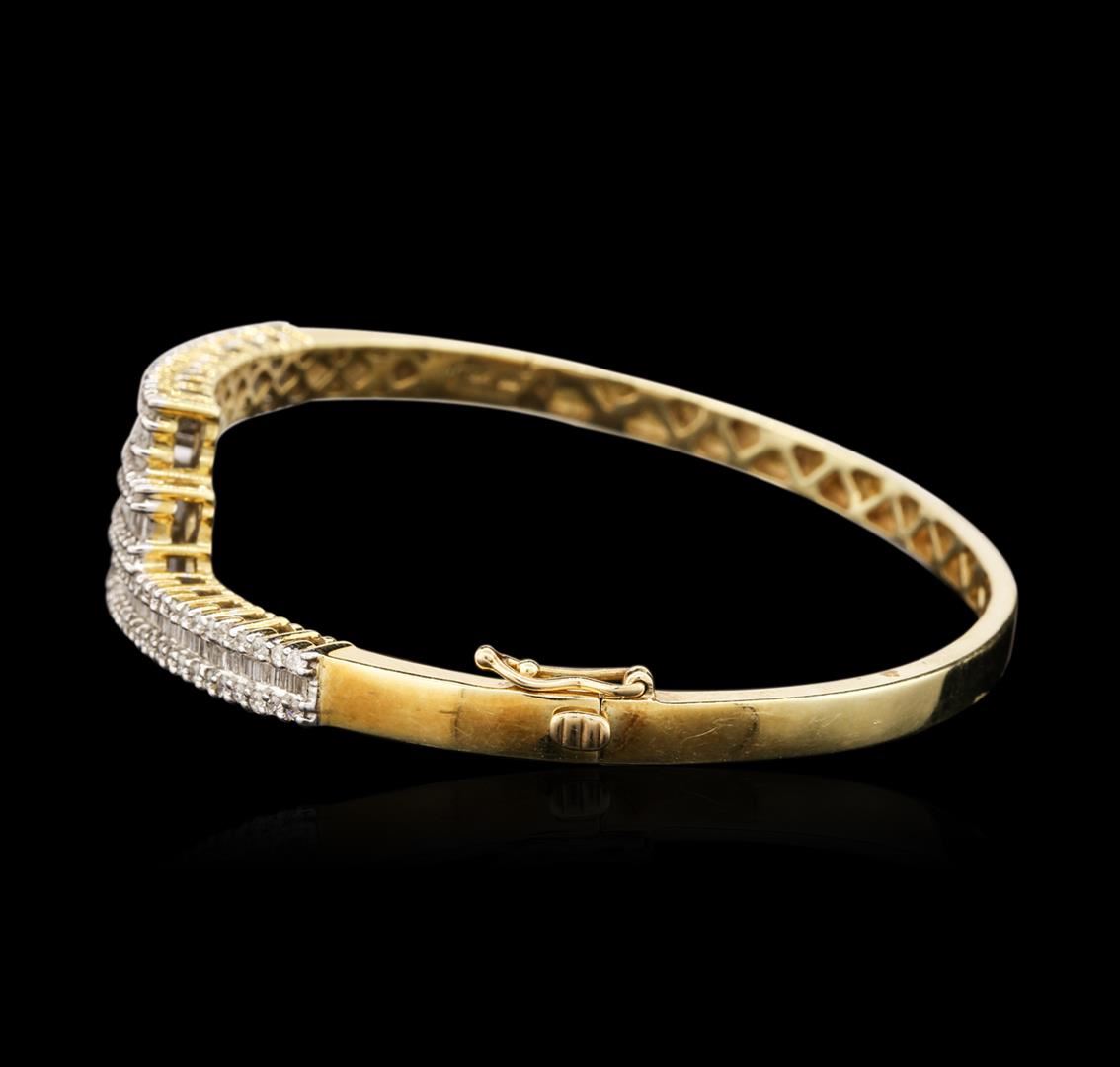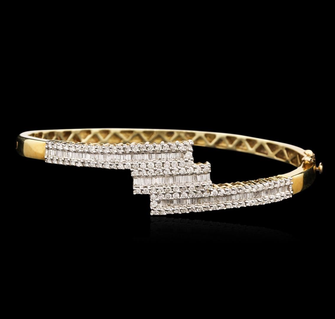 One electronically tested 14KT yellow gold ladies cast & assembled diamond bangle bracelet. Seven inch wearable length bangle bracelet features a stylized diamond set bypass design supported by hinged shoulders, completed by a concealed clasp with safety. Bright polish finish with rhodium accents. Identified with markings of "14K". Condition is good. Containing: One Hundred Six prong set round brilliant cut diamonds, measuring 1.60 - 1.50 x 0.93mm (depth est.) approximate total weight of 106 Stones = 1.54ct. Graded in the setting. Clarity: I-2 to I-3. Color: H - J One Hundred Twenty-Eight channel set baguette cut diamonds, measuring from 1.50 x 0.70 x 0.49mm (depth est.) to 1.70 x 0.80 x 0.56mm (depth est.) approximate total weight of 128 Stones = 0.73ct. Graded in the setting. Clarity: SI-2 to I-1. Color: H - J. Total Weight of Diamonds 2.27ct. Total Weight of Bangle Bracelet 19.32 grams. AIG Appraised at $8,010.00.