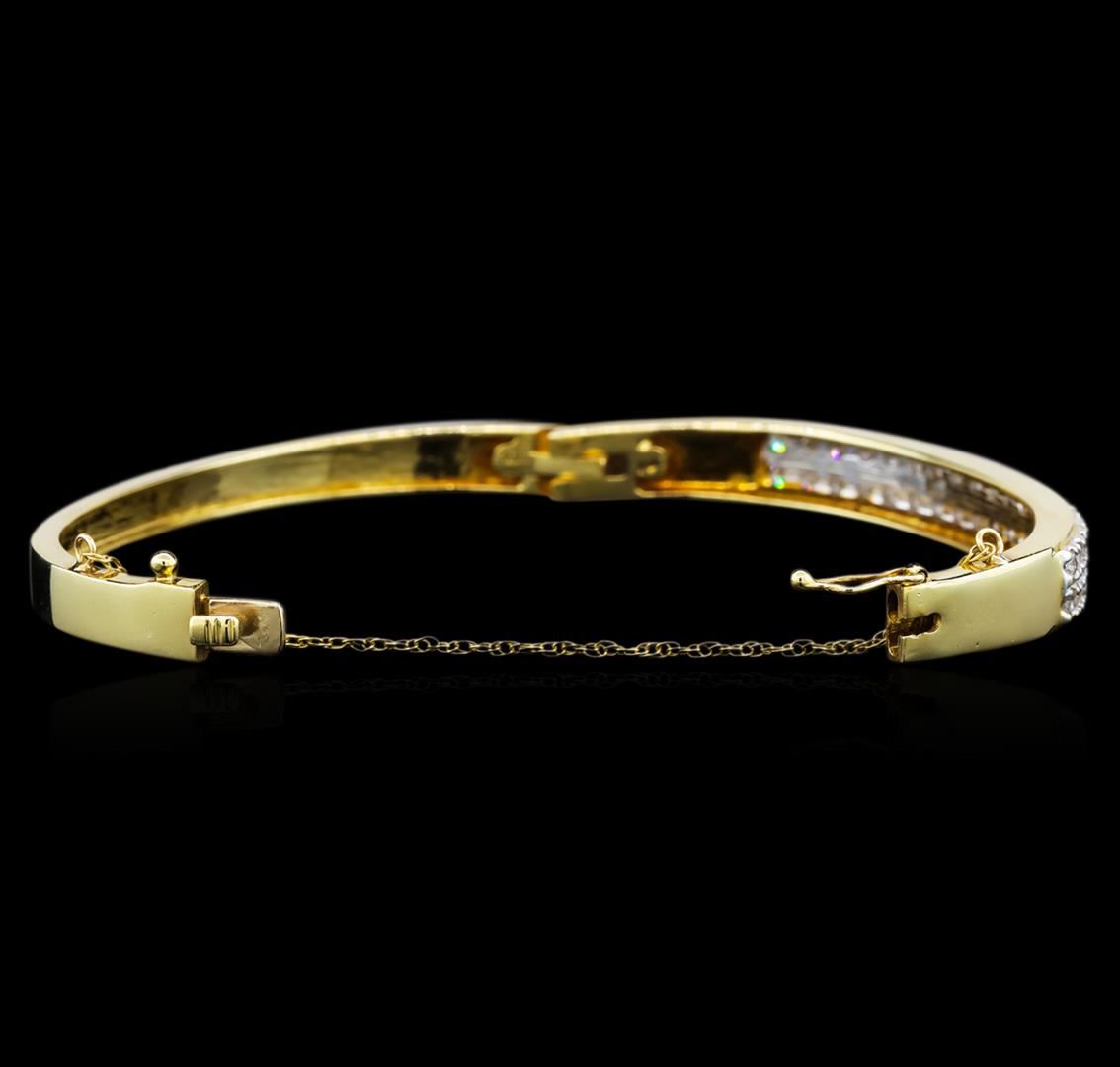 One electronically tested 14KT yellow gold ladies cast diamond bangle bracelet with a hidden box clasp with safety closer with a bright polish finish. Condition is very good. Containing: Forty prong set round brilliant cut diamonds, measuring 2.50 - 2.50 x 1.50mm (depth est.) approximate total weight of 40 Stones = 2.28ct. Clarity: I-1 to I-2. Color: I - J, Cut is Good. All diamonds are graded in the mounting, unless otherwise stated. Total Weight of Diamonds 2.28ct. Total Weight of Bangle Bracelet 23.60 grams. GGL Appraised at $6,270.00.