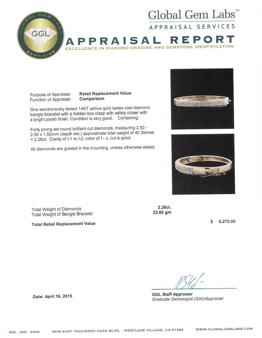 One electronically tested 14KT yellow gold ladies cast diamond bangle bracelet with a hidden box clasp with safety closer with a bright polish finish. Condition is very good. Containing: Forty prong set round brilliant cut diamonds, measuring 2.50 - 2.50 x 1.50mm (depth est.) approximate total weight of 40 Stones = 2.28ct. Clarity: I-1 to I-2. Color: I - J, Cut is Good. All diamonds are graded in the mounting, unless otherwise stated. Total Weight of Diamonds 2.28ct. Total Weight of Bangle Bracelet 23.60 grams. GGL Appraised at $6,270.00.