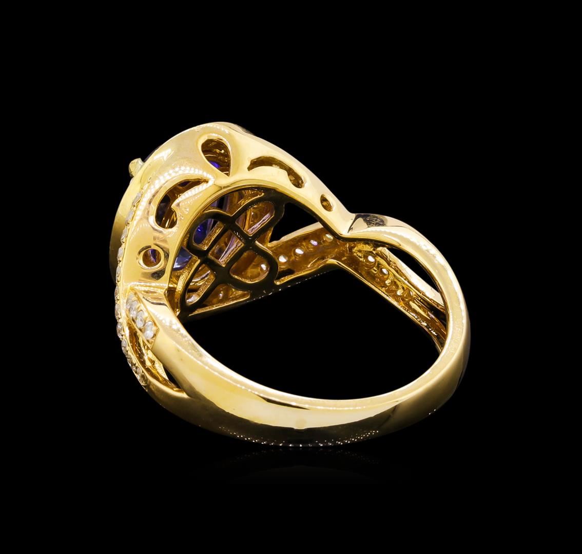 One electronically tested 14KT yellow gold ladies combination cast & assembled tanzanite and diamond ring with a split shank with a bright polish finish. Identified with markings of "14K". Condition is new. Containing: One prong set oval modified brilliant cut natural tanzanite, measuring 9.94 x 7.24 x 4.71mm, approximate weight of 2.33ct., clarity is eye clean, type I, medium light, moderately strong, violet color, (GIA V 4/4), cut is good. Sixty-Nine prong set round brilliant cut diamonds, measuring 1.10 - 1.10 x 0.66mm (depth est.) approximate total weight of 69 Stones = 0.33ct. Clarity: I-1 to I-2. Color: I - J, Cut is Good. Colored gemstones are presumed to have been subjected to commonly used enhancement processes. All diamonds and colored gemstones are graded in the mounting, unless otherwise stated. Total Weight of Colored Stones 2.33ct. Total Weight of Diamonds 0.33ct. Total Weight of Ring 5.90 grams. GGL Appraised at $5,980.00.