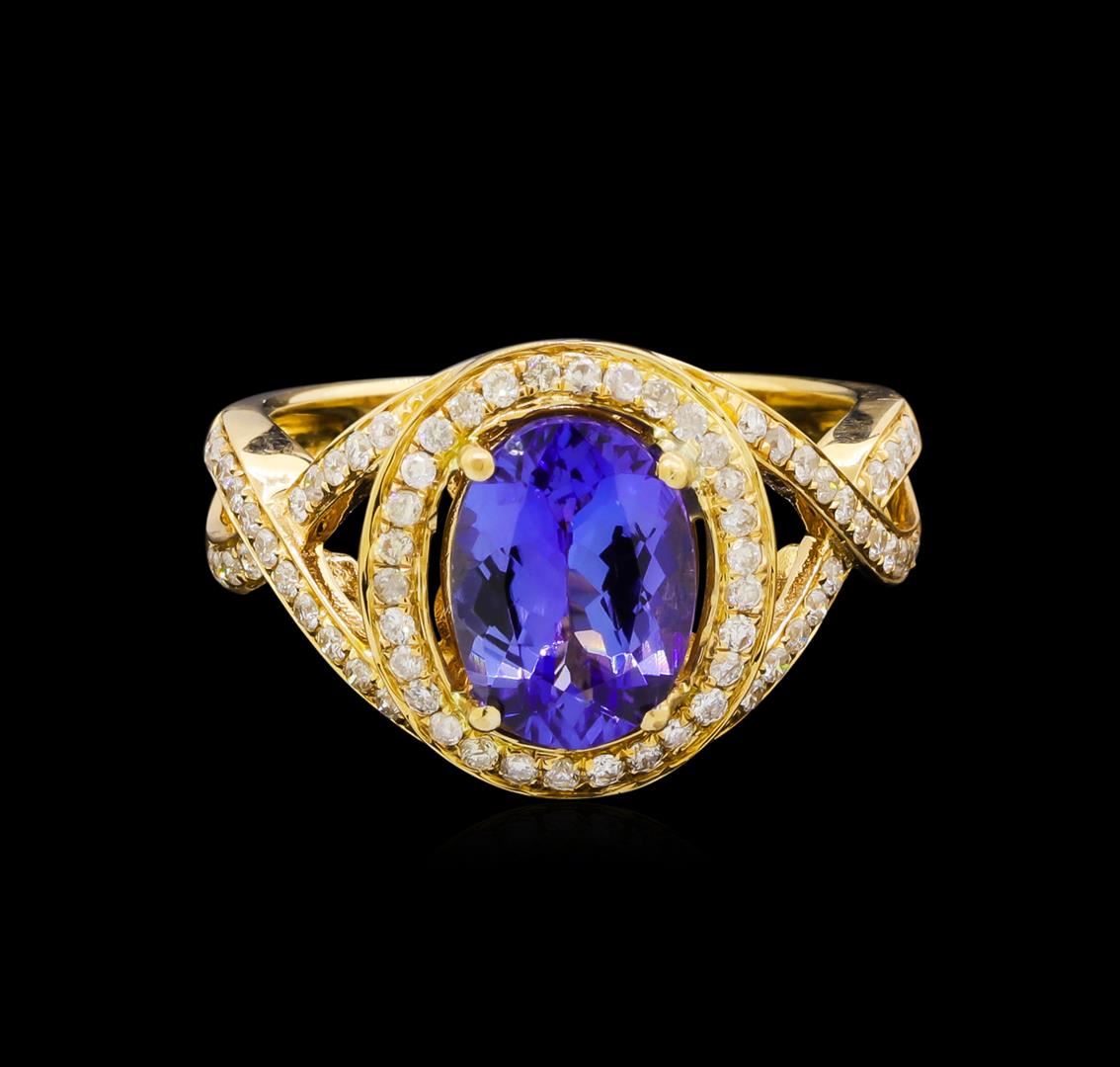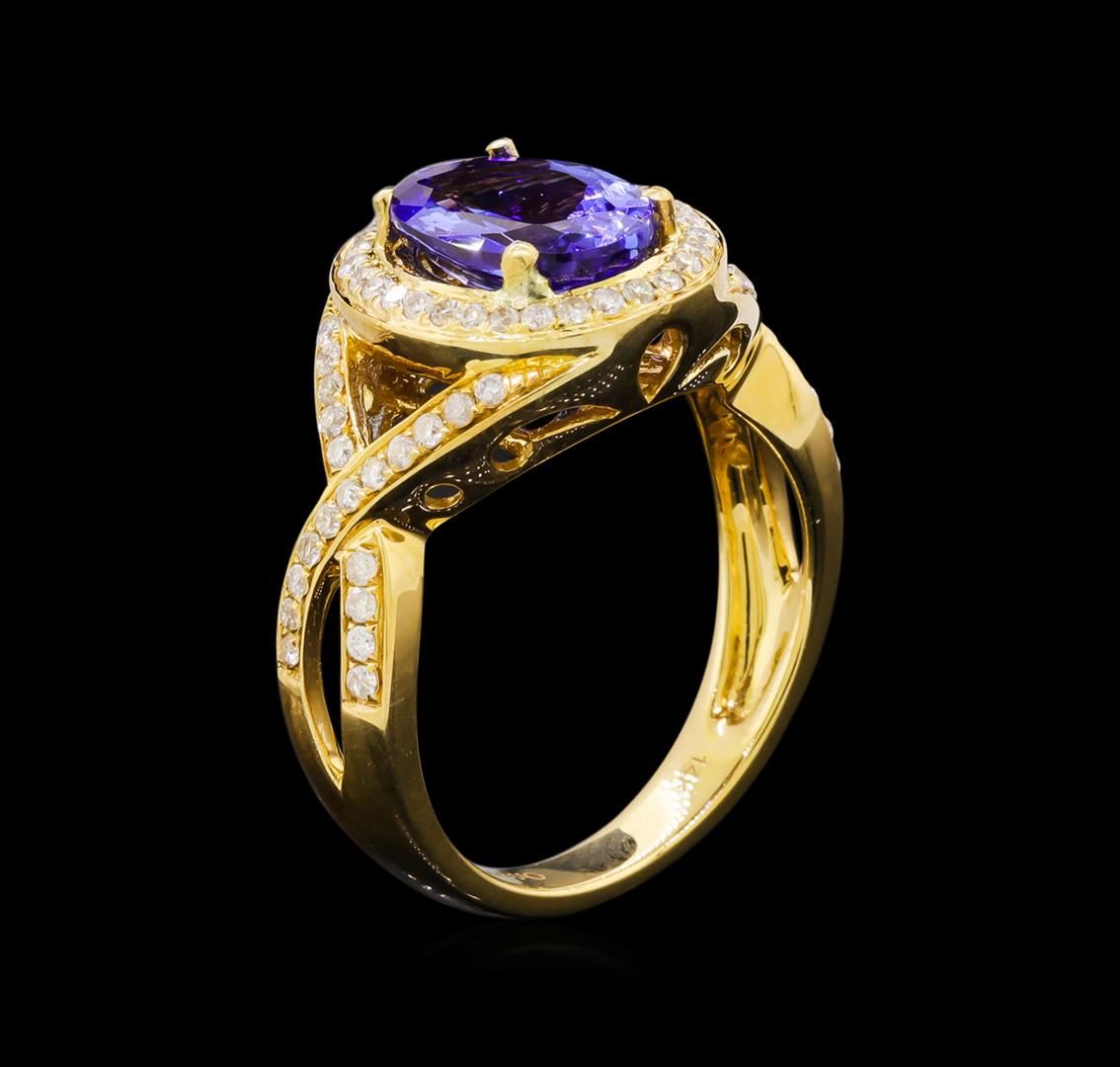 One electronically tested 14KT yellow gold ladies combination cast & assembled tanzanite and diamond ring with a split shank with a bright polish finish. Identified with markings of "14K". Condition is new. Containing: One prong set oval modified brilliant cut natural tanzanite, measuring 9.94 x 7.24 x 4.71mm, approximate weight of 2.33ct., clarity is eye clean, type I, medium light, moderately strong, violet color, (GIA V 4/4), cut is good. Sixty-Nine prong set round brilliant cut diamonds, measuring 1.10 - 1.10 x 0.66mm (depth est.) approximate total weight of 69 Stones = 0.33ct. Clarity: I-1 to I-2. Color: I - J, Cut is Good. Colored gemstones are presumed to have been subjected to commonly used enhancement processes. All diamonds and colored gemstones are graded in the mounting, unless otherwise stated. Total Weight of Colored Stones 2.33ct. Total Weight of Diamonds 0.33ct. Total Weight of Ring 5.90 grams. GGL Appraised at $5,980.00.