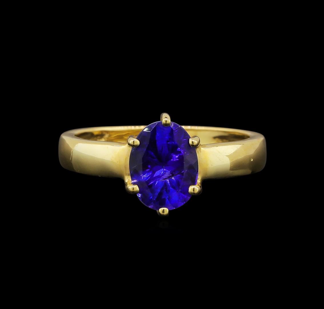 One electronically tested 14KT yellow gold ladies cast tanzanite ring with a bright polish finish. Identified with markings of "14K". Condition is new. Containing: One prong set oval modified brilliant cut natural tanzanite, measuring 9.30 x 6.90 x 5.20mm, approximate weight of 2.35ct., clarity is eye clean, type I, medium, moderately strong, blue color, (GIA B 5/4), cut is good. Colored gemstones are presumed to have been subjected to commonly used enhancement processes. All colored gemstones are graded in the mounting, unless otherwise stated. Total Weight of Colored Stones 2.35ct. Total Weight of Ring 3.80 grams. GGL Appraised at $1,640.00.