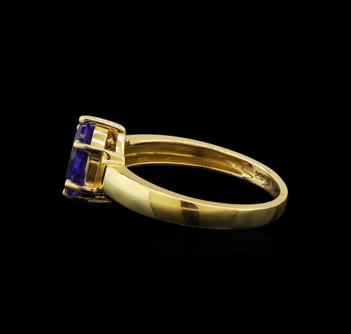 One electronically tested 14KT yellow gold ladies cast tanzanite ring with a bright polish finish. Identified with markings of "14K". Condition is new. Containing: One prong set oval modified brilliant cut natural tanzanite, measuring 9.30 x 6.90 x 5.20mm, approximate weight of 2.35ct., clarity is eye clean, type I, medium, moderately strong, blue color, (GIA B 5/4), cut is good. Colored gemstones are presumed to have been subjected to commonly used enhancement processes. All colored gemstones are graded in the mounting, unless otherwise stated. Total Weight of Colored Stones 2.35ct. Total Weight of Ring 3.80 grams. GGL Appraised at $1,640.00.