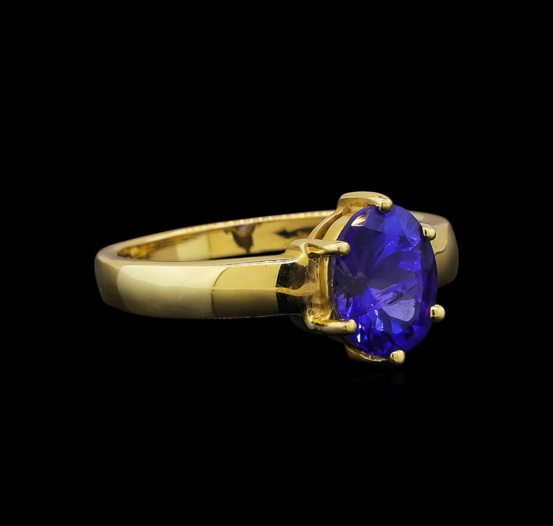 One electronically tested 14KT yellow gold ladies cast tanzanite ring with a bright polish finish. Identified with markings of "14K". Condition is new. Containing: One prong set oval modified brilliant cut natural tanzanite, measuring 9.30 x 6.90 x 5.20mm, approximate weight of 2.35ct., clarity is eye clean, type I, medium, moderately strong, blue color, (GIA B 5/4), cut is good. Colored gemstones are presumed to have been subjected to commonly used enhancement processes. All colored gemstones are graded in the mounting, unless otherwise stated. Total Weight of Colored Stones 2.35ct. Total Weight of Ring 3.80 grams. GGL Appraised at $1,640.00.