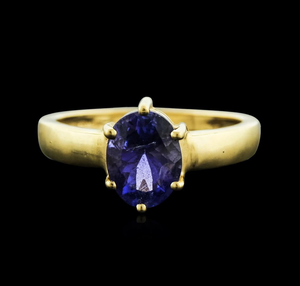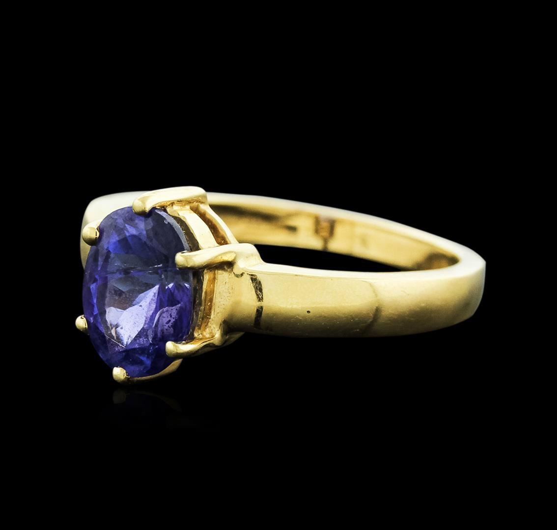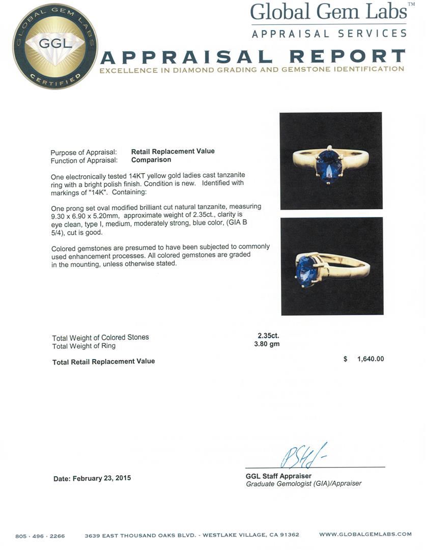 One electronically tested 14KT yellow gold ladies cast tanzanite ring with a bright polish finish. Identified with markings of "14K". Condition is new. Containing: One prong set oval modified brilliant cut natural tanzanite, measuring 9.30 x 6.90 x 5.20mm, approximate weight of 2.35ct., clarity is eye clean, type I, medium, moderately strong, blue color, (GIA B 5/4), cut is good. Colored gemstones are presumed to have been subjected to commonly used enhancement processes. All colored gemstones are graded in the mounting, unless otherwise stated. Total Weight of Colored Stones 2.35ct. Total Weight of Ring 3.80 grams. GGL Appraised at $1,640.00.