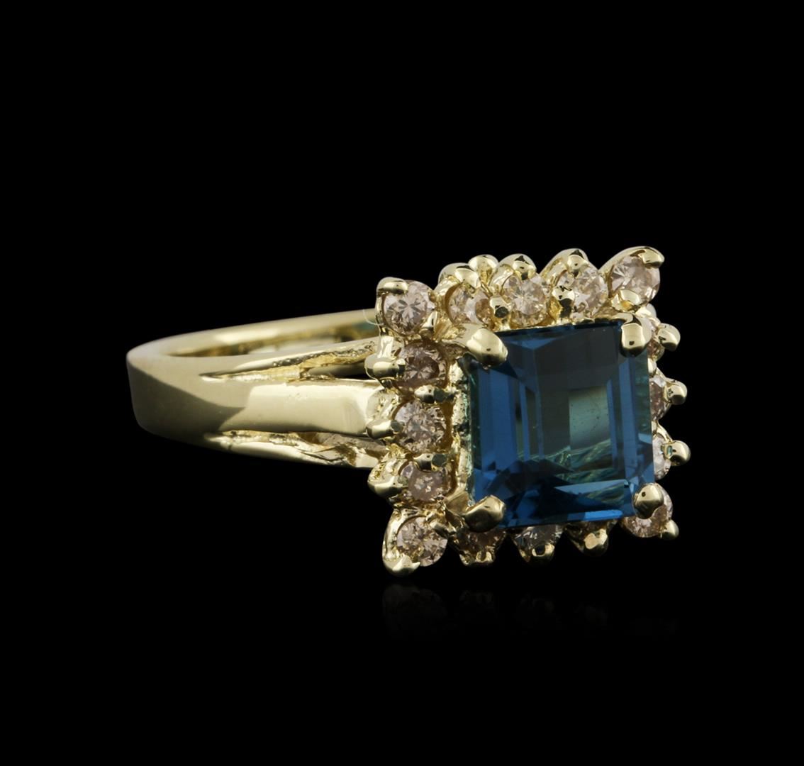 One ring featuring: 14KT yellow gold weighing 4.00 grams containing one blue topaz center stone with a total weight of 2.35ct and prong set round diamonds with a total weight of 0.48ct.