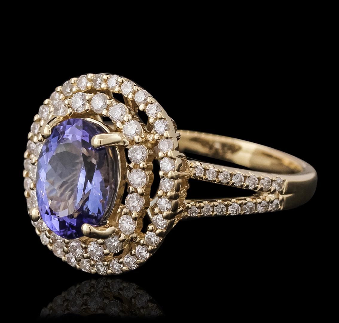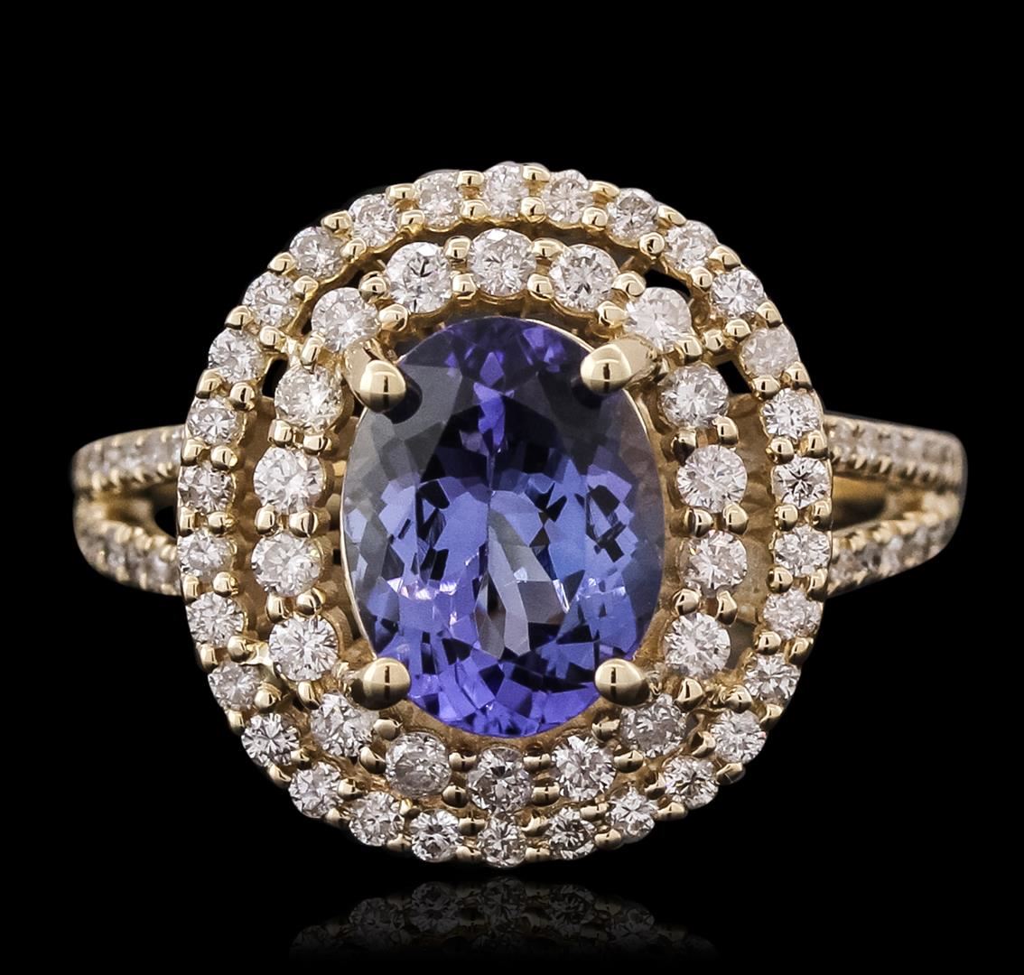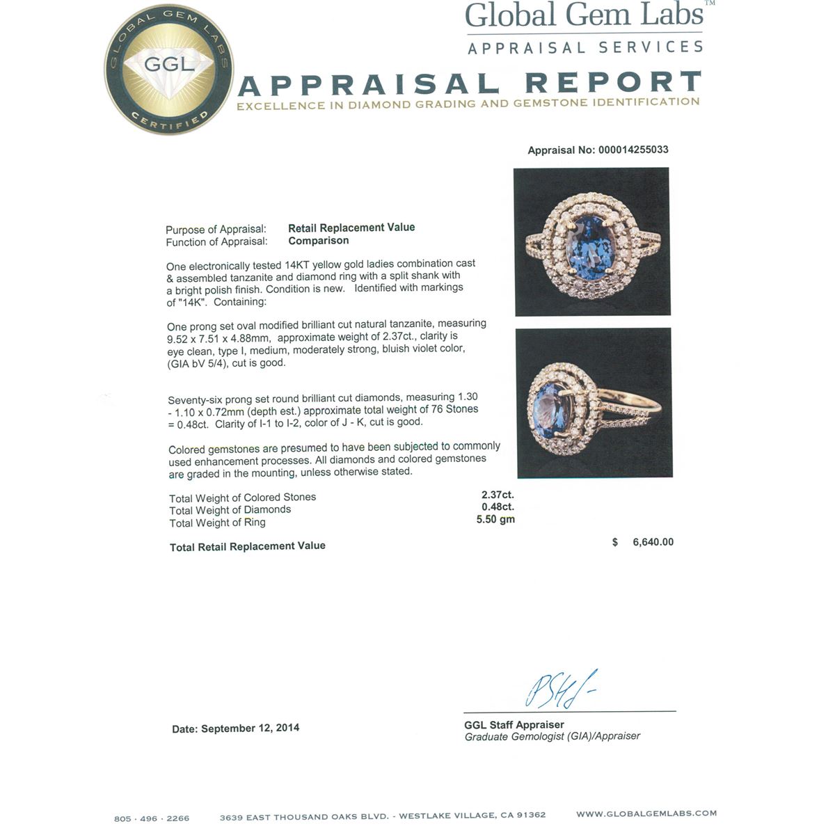 One electronically tested 14KT yellow gold ladies combination cast & assembled tanzanite and diamond ring with a split shank with a bright polish finish. Identified with markings of "14K". Condition is new. Containing: One prong set oval modified brilliant cut natural tanzanite, measuring 9.52 x 7.51 x 4.88mm, approximate weight of 2.37ct., clarity is eye clean, type I, medium, moderately strong, bluish violet color, (GIA bV 5/4), cut is good. Seventy-Six prong set round brilliant cut diamonds, measuring 1.30 - 1.10 x 0.72mm (depth est.) approximate total weight of 76 Stones = 0.48ct. Clarity: I-1 to I-2. Color: J - K, Cut is Good. Colored gemstones are presumed to have been subjected to commonly used enhancement processes. All diamonds and colored gemstones are graded in the mounting, unless otherwise stated total weight of Colored Stones 2.37ct. Total Weight of Diamonds 0.48ct. Total Weight of Ring 5.50 grams. GGL Appraised at $6,640.00.