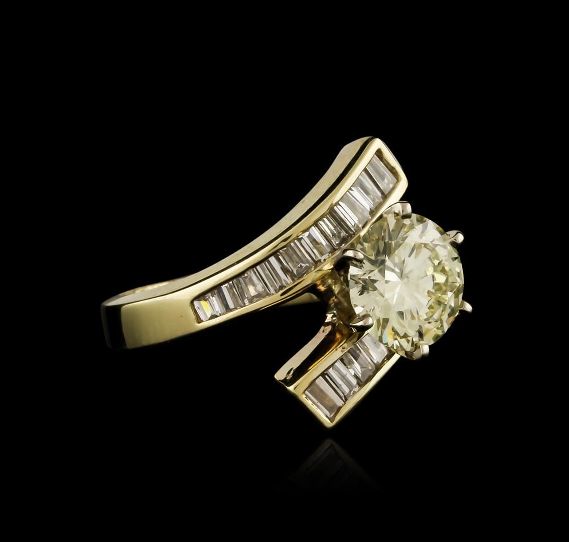 One electronically tested 14KT yellow gold ladies cast diamond engagement ring with a bright polish finish. Identified with markings of "14K". Condition is new. Containing: One prong set round brilliant cut diamond, measuring 7.85 - 7.85 x 4.71mm (depth est.) approximate weight of 1.77ct. Clarity: VS-2. Color: M, Cut is Good. Twenty channel set baguette cut diamonds, measuring from 1.50 x 1.00 x 0.85mm (depth est.) to 2.50 x 1.80 x 1.53mm (depth est.) approximate total weight of 20 Stones = 0.61ct. Clarity: I-1. Color: J - K, Cut is Good. All diamonds are graded in the mounting, unless otherwise stated. Total Weight of Diamonds 2.38ct. Total Weight of Engagement Ring 4.90 grams. GGL Appraised at $10,965.00.