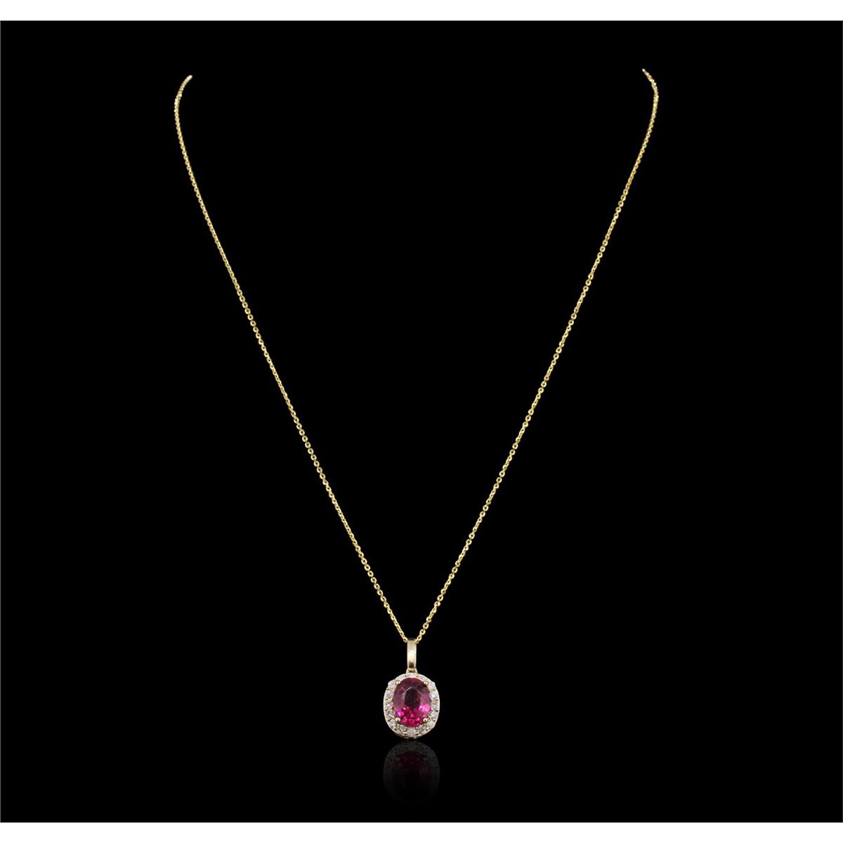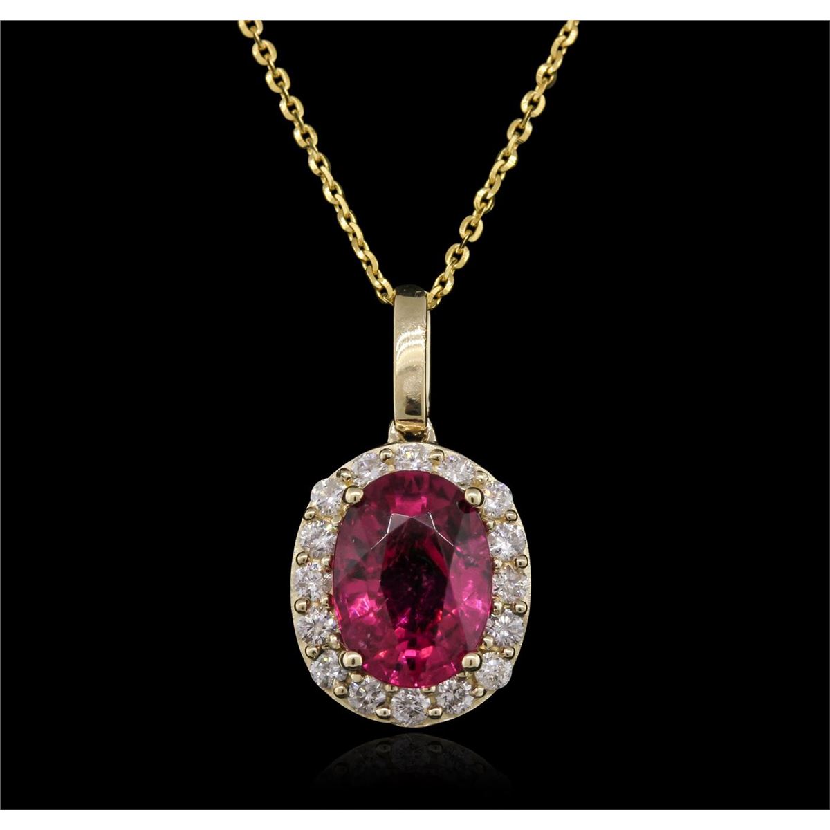 One electronically tested 14KT yellow gold Ladies combination cast & assembled pendant with a bright polish finish. Condition is new. Identified with markings of "14K". Containing: Seventeen bead set round brilliant cut diamonds, measuring 1.90 - 1.90 x 1.14mm (depth est.) approximate. Total Weight of 17 Stones = 0.48ct. Clarity: SI-2 to I-1. Color: G - H, Cut is Good. One prong set oval modified brilliant cut natural pink tourmaline, measuring 10.00 x 7.30 x 4.90mm, exact weight 2.42ct., clarity is eye clean, type II, medium, moderately strong, reddish purple color, (GIA rP 5/4), cut is very good. Colored gemstones are presumed to have been subjected to commonly used color/clarity enhancement processes. Total Weight of Colored Stones 2.42ct. Total Weight of Diamonds 0.48ct. Total Weight of Pendant 3.70 grams. GGL Appraised at $4,565.00.
