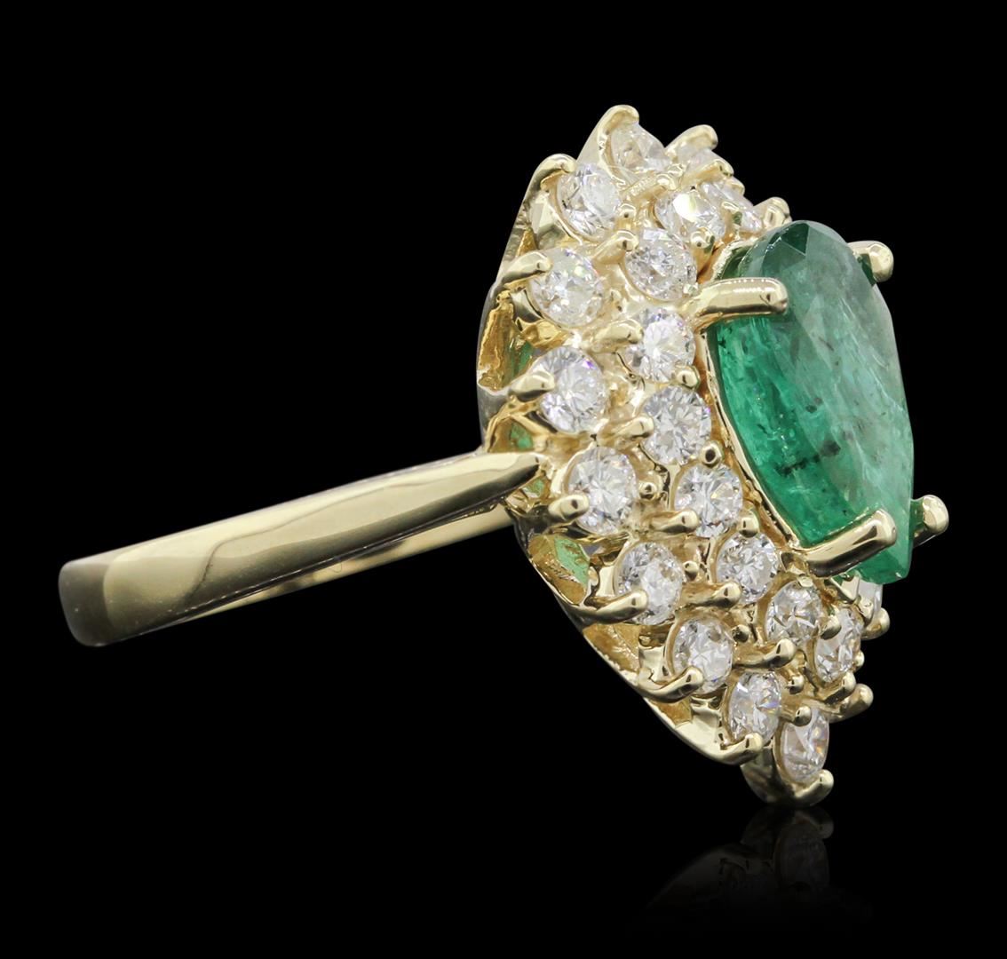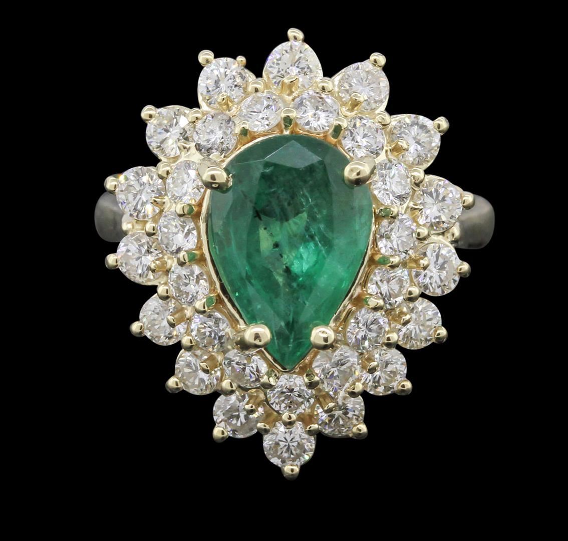 One electronically tested 14KT yellow gold Ladies combination cast & assembled fashion ring with a bright polish finish. Condition is new. Identified with markings of "14K". Containing: One prong set pear modified brillant cut emerald, measuring 10.90 x 7.60 x 5.40mm, approximate weight of 2.43ct. clarity is heavily included, type III, medium, moderately strong, very slightly bluish green color, (GIA vslbG 5/4), cut is good. Colored gemstones are presumed to have been subjected to commonly used and possible undetectable color/clarity enhancement processes. Sixteen prong set round brilliant cut diamonds, measuring 2.50 -2.50 x 1.500mm (depth est.) approximate total weight of the 16 stones is 0.91ct. Clarity of I-1 to I-2, color of I - J, cut is good. Fifteen prong set round brilliant cut diamonds, measuring 2.00 -2.00 x 1.20mm (depth est.) approximate total weight of 15 stones is 0.44ct. Clarity of I-1 to I-2, color of I - J, cut is good. Total weight if emerald is 2.43cts. Total weight of diamonds is 1.35cts. Total weight of the ring is 7.10 grams. GGL Appraised at $9,270.00.