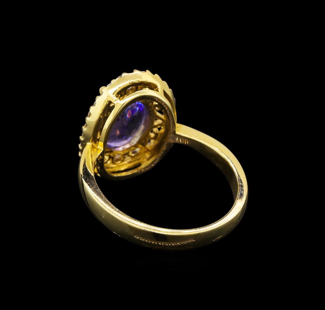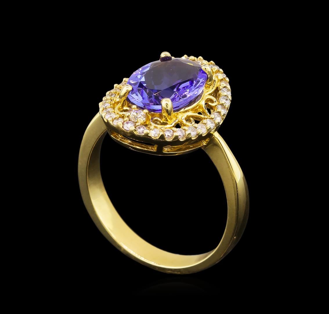 One electronically tested 14KT yellow gold ladies cast tanzanite and diamond ring with a bright polish finish. Identified with markings of "K14". Condition is new. Containing: One prong set oval modified brilliant cut natural tanzanite, measuring 10.90 x 7.80 x 4.10mm, approximate weight of 2.45ct., clarity is eye clean, type I, medium light, very slightly grayish, violet color, (GIA V 4/3), cut is good. Thirty-Two prong set round brilliant cut diamonds, measuring 1.90 - 1.20 x 0.93mm (depth est.) approximate total weight of 32 Stones = 0.22ct. Clarity: SI-1 to I-1. Color: H - I, Cut is Good. Colored gemstones are presumed to have been subjected to commonly used enhancement processes. All diamonds and colored gemstones are graded in the mounting, unless otherwise stated. Total Weight of Colored Stones 2.45ct. Total Weight of Diamonds 0.22ct. Total Weight of Ring 4.70 grams. GGL Appraised at $2,775.00.