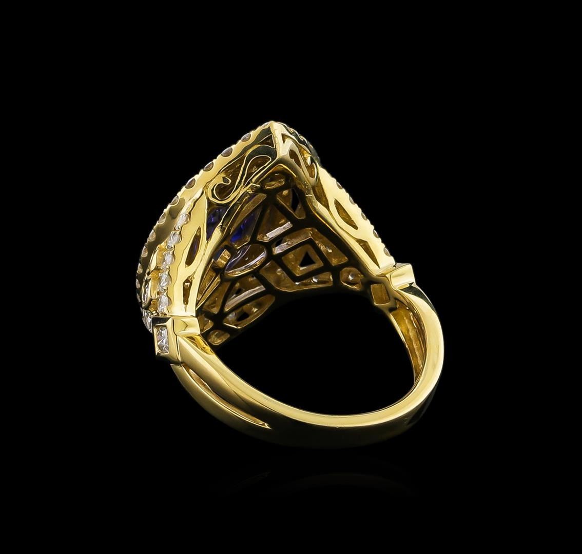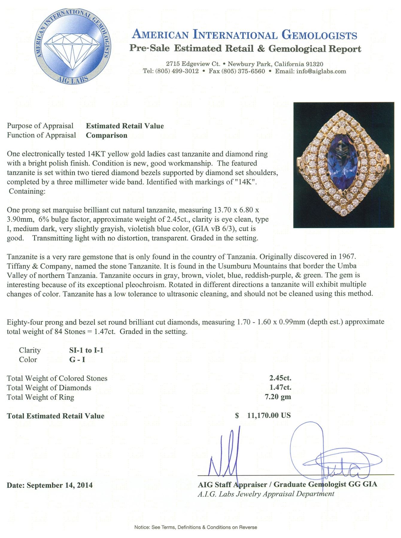 One electronically tested 14KT yellow gold ladies cast tanzanite and diamond ring with a bright polish finish. The featured tanzanite is set within two tiered diamond bezels supported by diamond set shoulders, completed by a three millimeter wide band. Identified with markings of "14K". Condition is new, good workmanship. Containing: One prong set marquise brilliant cut natural tanzanite, measuring 13.70 x 6.80 x 3.90mm, 6% bulge factor, approximate weight of 2.45ct., clarity is eye clean, type I, medium dark, very slightly grayish, violetish blue color, (GIA vB 6/3), cut is good. Transmitting light with no distortion, transparent. Graded in the setting. Tanzanite is a very rare gemstone that is only found in the country of Tanzania. Originally discovered in 1967. Tiffany & Company, named the stone Tanzanite. It is found in the Usumburu Mountains that border the Umba Valley of northern Tanzania. Tanzanite occurs in gray, brown, violet, blue, reddish-purple, & green. The gem is interesting because of its exceptional pleochroism. Rotated in different directions a tanzanite will exhibit multiple changes of color. Tanzanite has a low tolerance to ultrasonic cleaning, and should not be cleaned using this method. Eighty-Four prong and bezel set round brilliant cut diamonds, measuring 1.70 - 1.60 x 0.99mm (depth est.) approximate total weight of 84 Stones = 1.47ct. Graded in the setting. Clarity: SI-1 to I-1. Color: G - I. Total Weight of Colored Stones 2.45ct. Total Weight of Diamonds 1.47ct. Total Weight of Ring 7.20 grams. AIG Appraised.