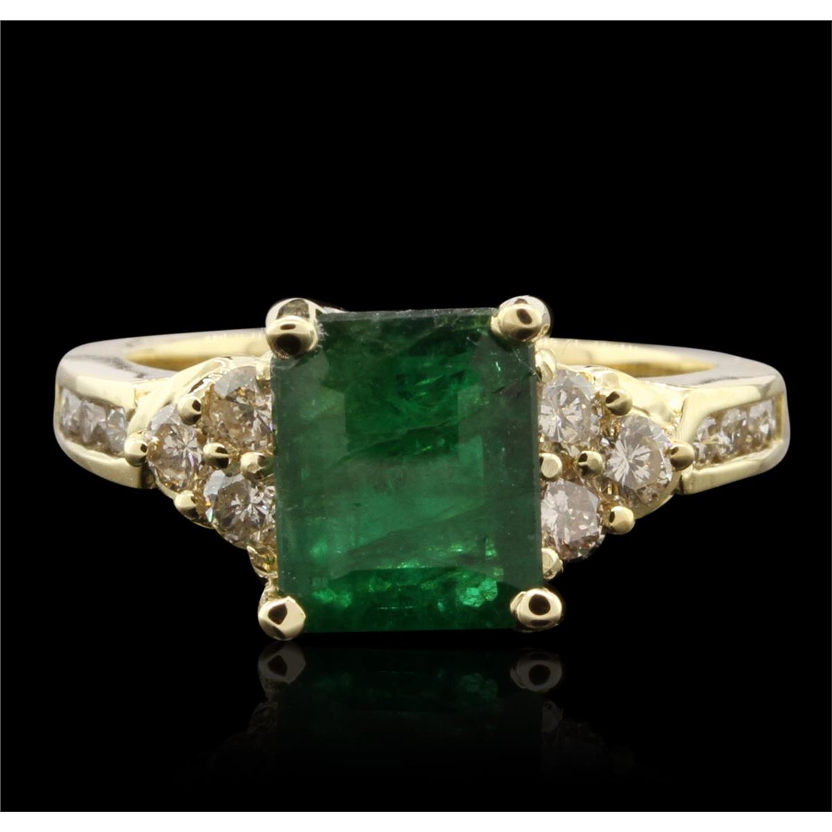 One electronically tested 14KT yellow gold ladies cast emerald and diamond ring with a bright polish finish. The featured emerald is supported by elaborate diamond set shoulders, completed by a two and one-half millimeter wide band. Identified with markings of "14K". Condition is new, good workmanship. Containing: One prong set rectangular step cut natural emerald, measuring 8.80 x 7.15 x 4.42mm, 8%. bulge factor, approximate weight of 2.45ct., clarity is heavily included, type III, medium dark, very slightly grayish, very slightly bluish green color, (GIA vslbG 6/3), cut is good. Transmitting light with a minimum of distortion, transparent. Naturally occurring internal & external characteristics are present. Indications of oil & opticon residue. Graded in the setting. Six prong set round brilliant cut diamonds, measuring 2.60 - 2.50 x 1.53mm (depth est.) approximate. Total Weight of 6 Stones = 0.46ct. Graded in the setting. Clarity: SI-1 to I-1 . Color: H - J Eight channel set round brilliant cut diamonds, measuring 1.80 - 1.80 x 1.08mm (depth est.) approximate. Total Weight of 8 Stones = 0.27ct. Graded in the setting. Clarity: SI-1 to I-1 . Color: G - I. Total Weight of Colored Stones 2.45ct. Total Weight of Diamonds 0.73ct. AIG Appraised at $5,810.00.