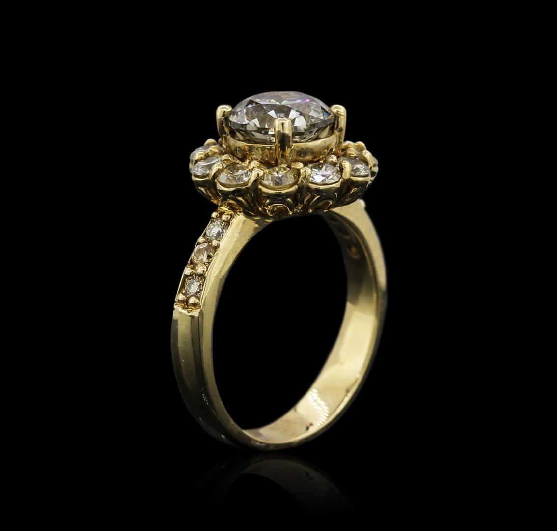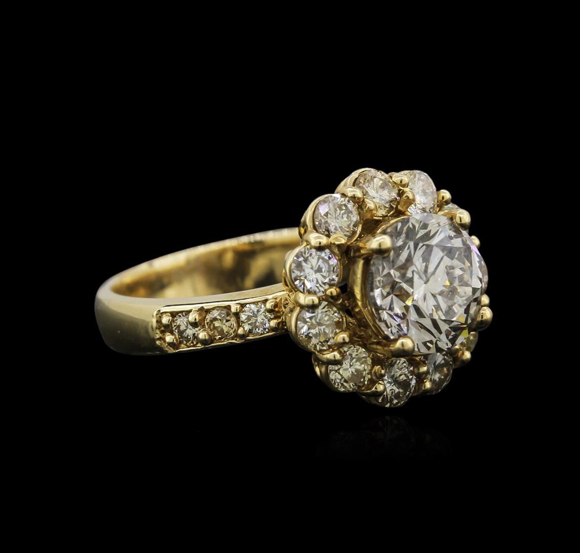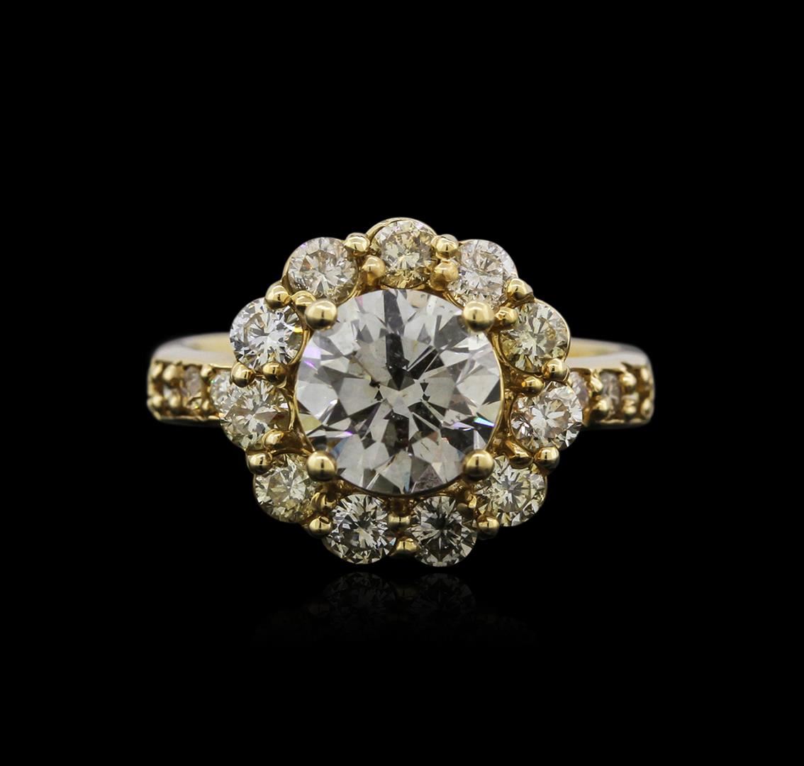 One electronically tested 14KT yellow gold ladies cast diamond engagement ring with a bright polish finish. Identified with markings of "585". Condition is new. Containing: One prong set round brilliant cut diamond, measuring 7.80 - 7.80 x 5.00mm (depth est.) approximate weight of 1.86ct. Clarity: VS-2. Color: L, Cut is Good. Seventeen prong set round brilliant cut diamonds, measuring 2.50 - 1.50 x 1.20mm (depth est.) approximate total weight of 17 Stones = 0.60ct. Clarity: SI-2 to I-1. Color: L - M, Cut is Good. Diamonds are graded in the mounting, unless otherwise stated. Total Weight of Diamonds 2.46ct. Total Weight of Engagement Ring 6.00 grams. GGL Appraised at $13,535.00.